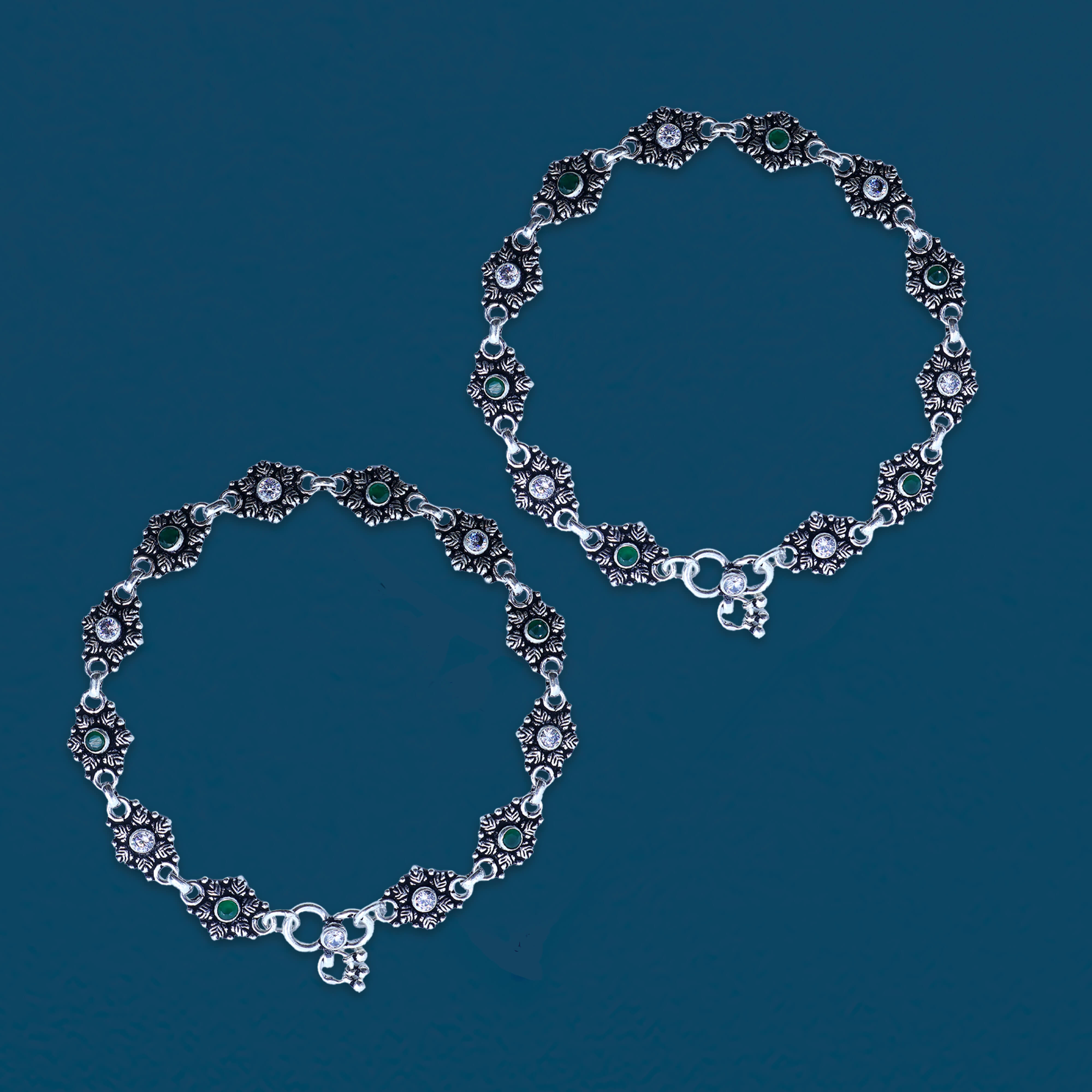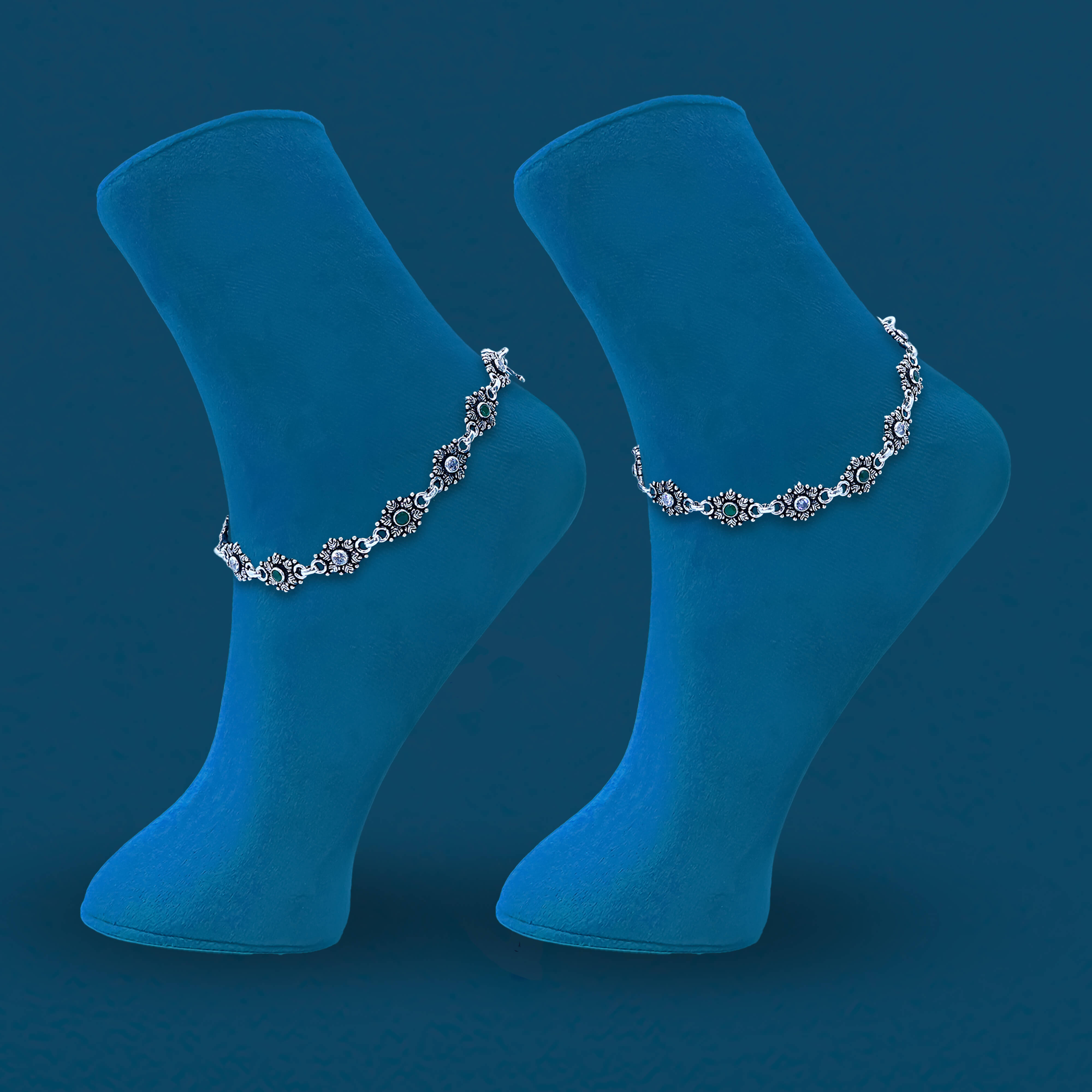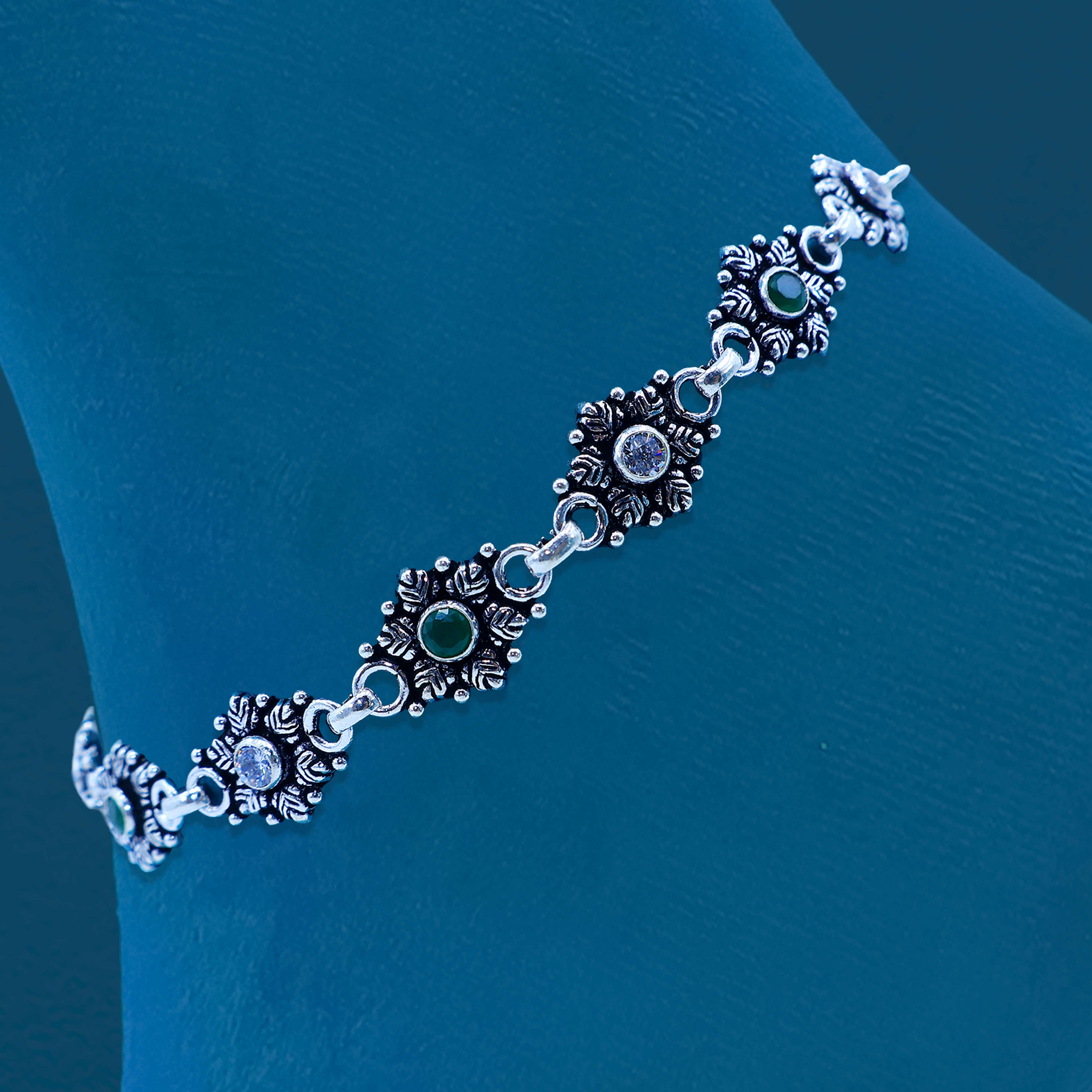 The Sterling Silver Flower Cut Anklet is a stunning piece crafted from 925 oxidized silver, featuring intricate flower-cut designs adorned with shimmering green and white stones. The oxidized finish enhances its vintage charm, while the vibrant stones add a touch of elegance and sparkle. Lightweight and adjustable, this anklet is perfect for everyday wear or special occasions, offering a beautiful blend of tradition and modern style. The Flower Cut Anklet is a captivating addition to any jewelry collection, radiating grace and sophistication.