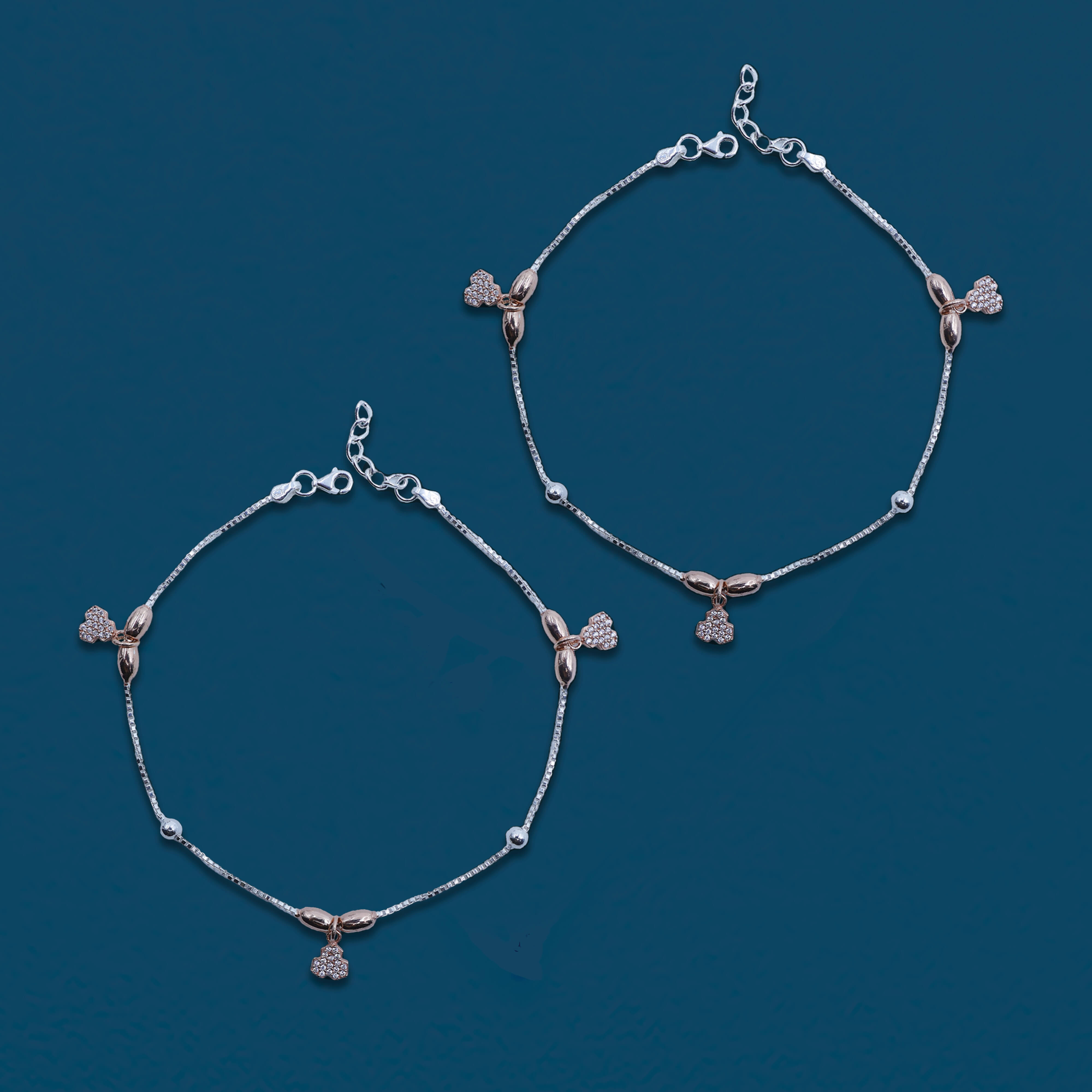 This exquisite anklet features a stunning combination of 925 sterling silver with a rose gold and silver polish, giving it a luxurious and elegant look. The design showcases a cascade of delicate links adorned with sparkling zircons, adding a touch of brilliance and charm. Perfect for elevating any outfit, this anklet is a must-have accessory for those who appreciate fine jewelry with a modern twist.