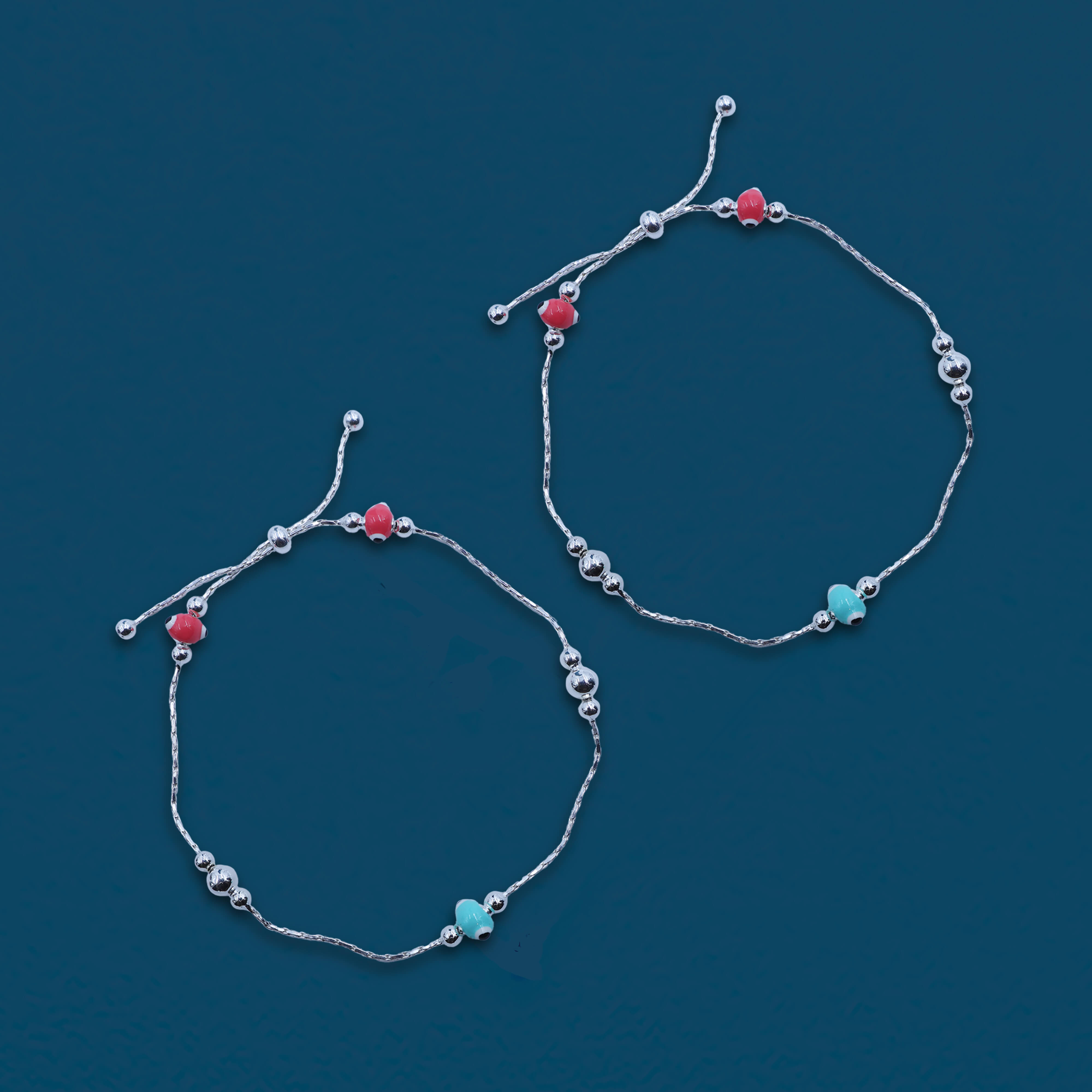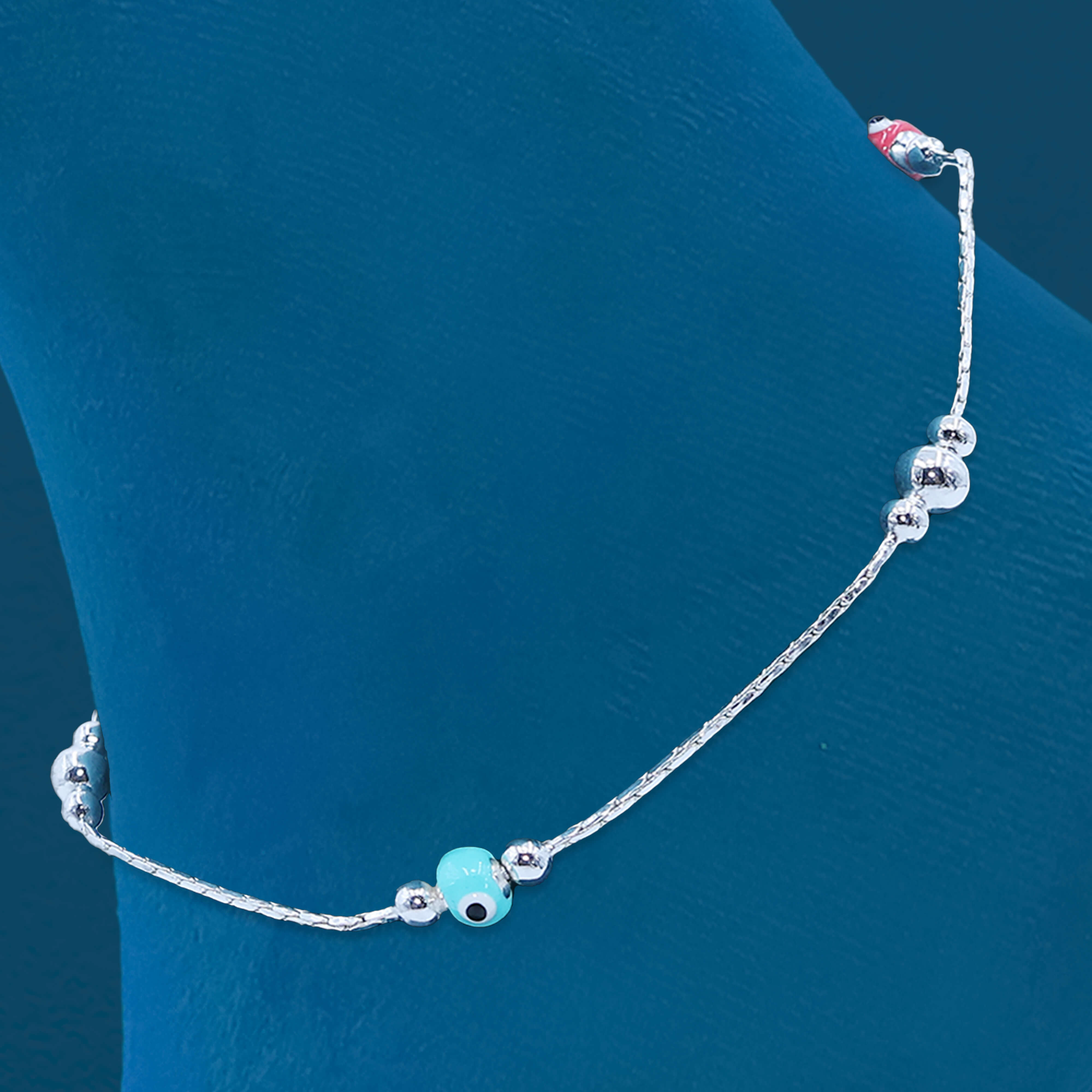 The Enchanted Eye Moti Anklet is a captivating piece crafted from 925 sterling silver, featuring a striking eye-shaped charm paired with delicate moti (pearl) accents. The design combines traditional elegance with a modern twist, making it perfect for both everyday wear and special occasions. Lightweight and adjustable for a comfortable fit, this anklet adds a touch of mystique and charm to any outfit. With its unique design, the Enchanted Eye Moti Anklet is a beautiful addition to any jewelry collection.