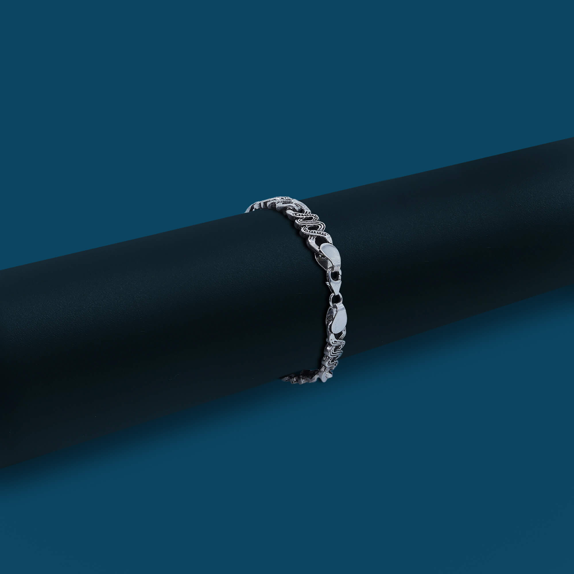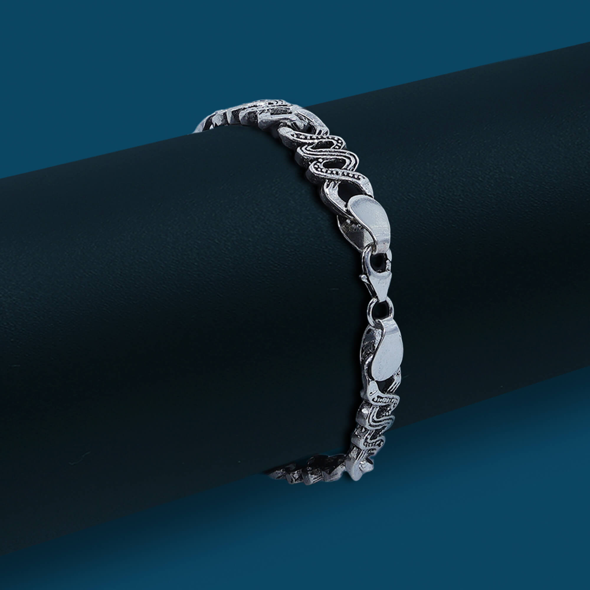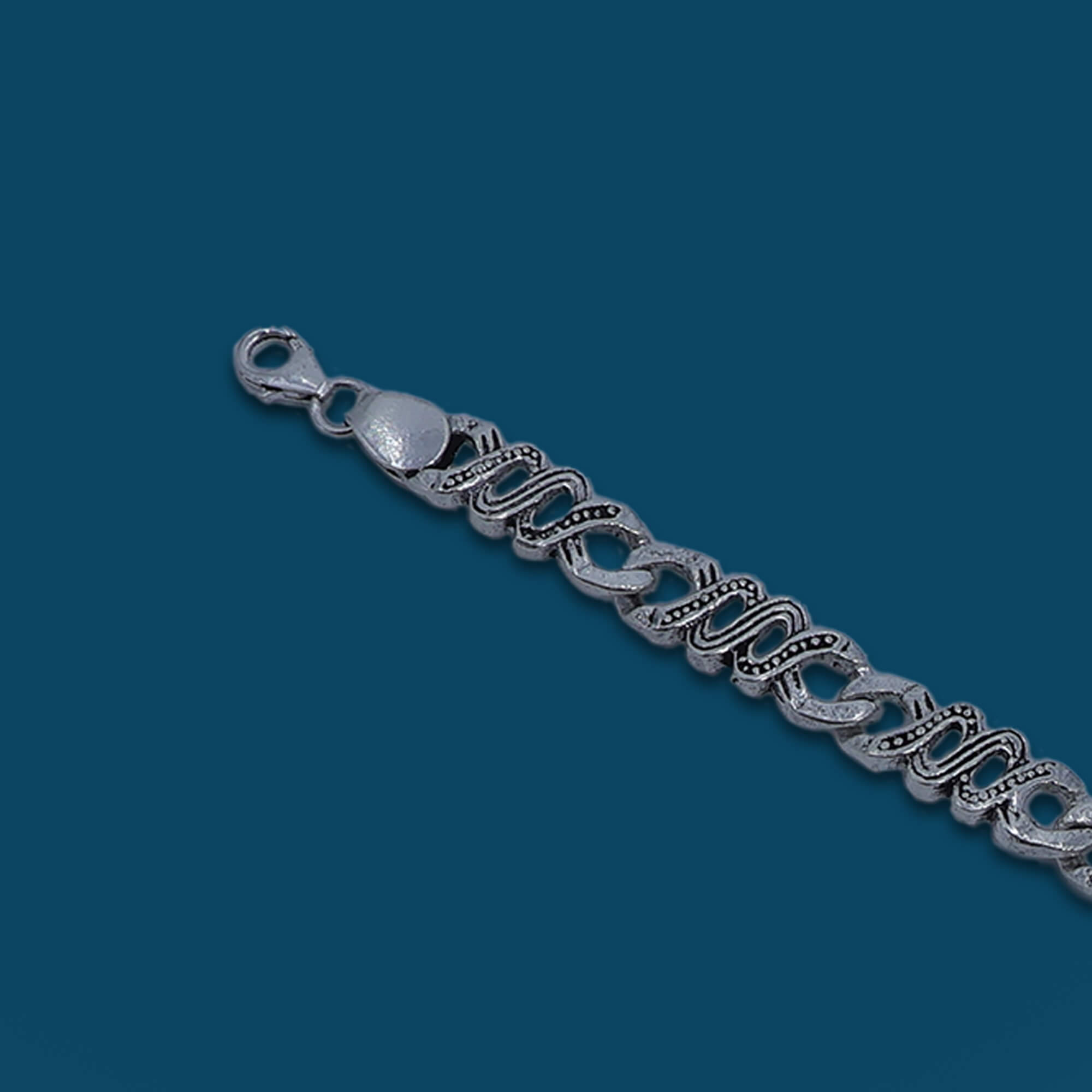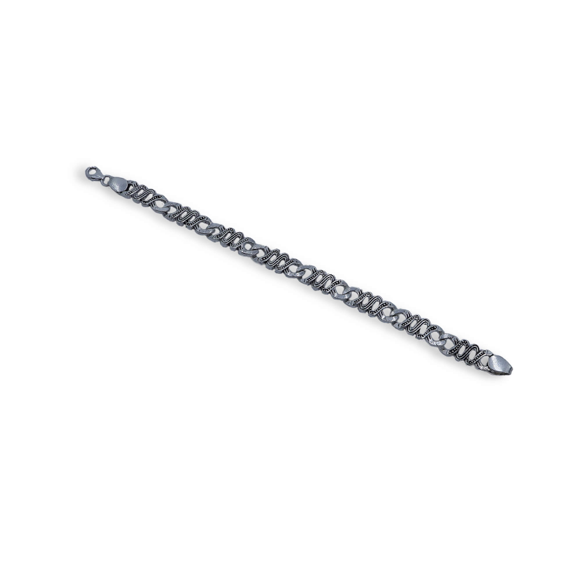The DNA Styled Oxidized Gents Bracelet features a bold, contemporary design inspired by the structure of DNA, with intertwined, spiral-shaped links. Finished with a sleek oxidized look, this bracelet combines modern style with intricate detailing. Its rugged yet sophisticated appearance makes it an ideal accessory for adding a unique, edgy touch to any outfit. Perfect for the fashion-forward man who values both artistry and masculinity in his accessories.
