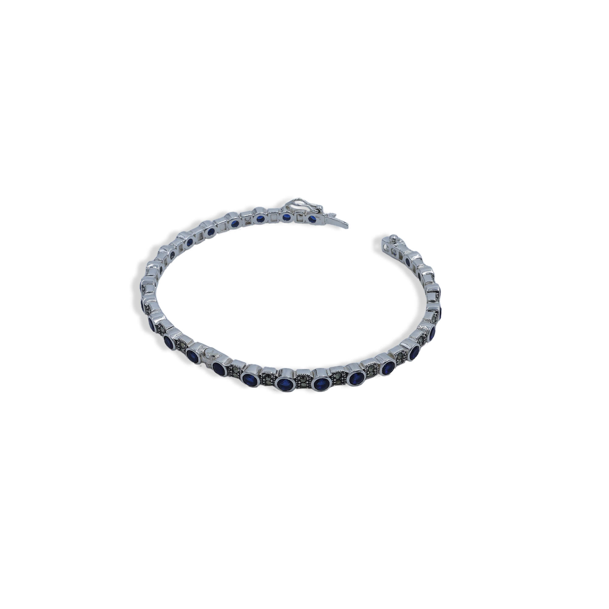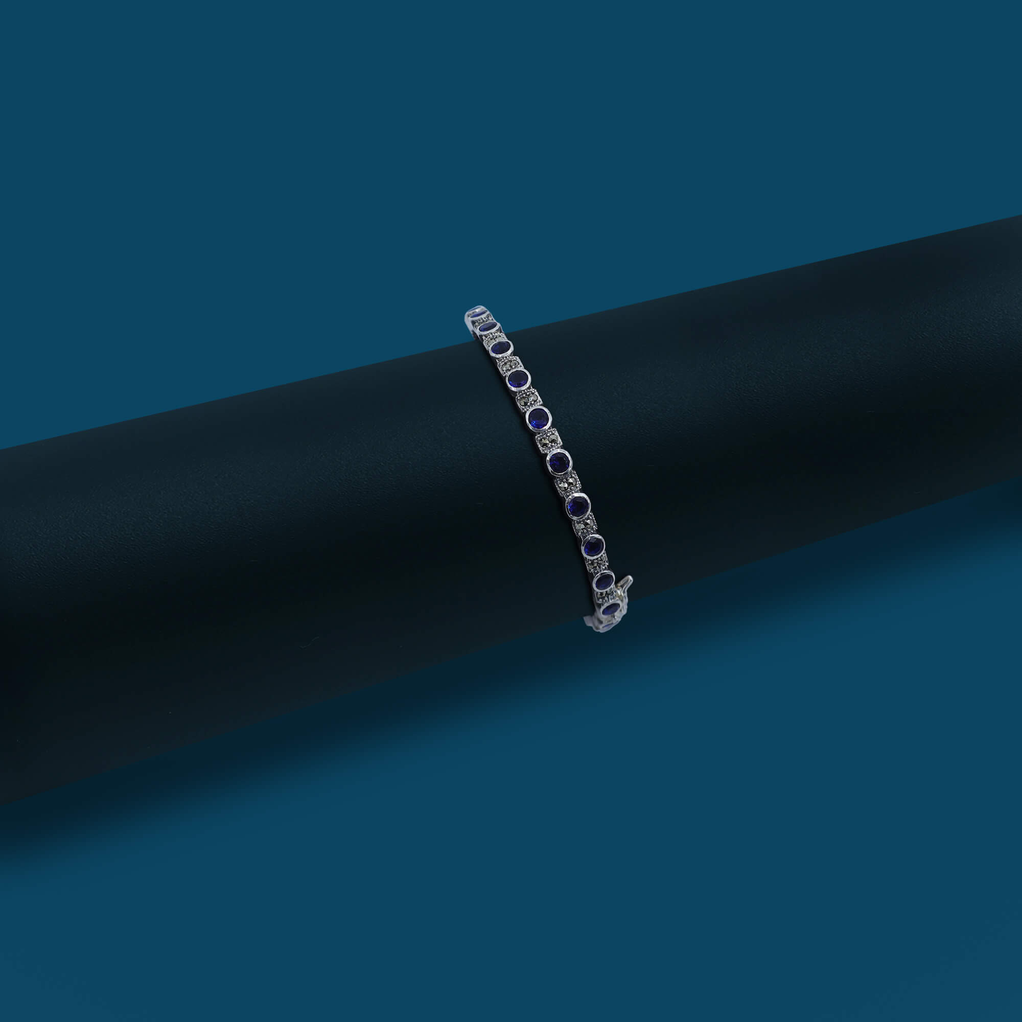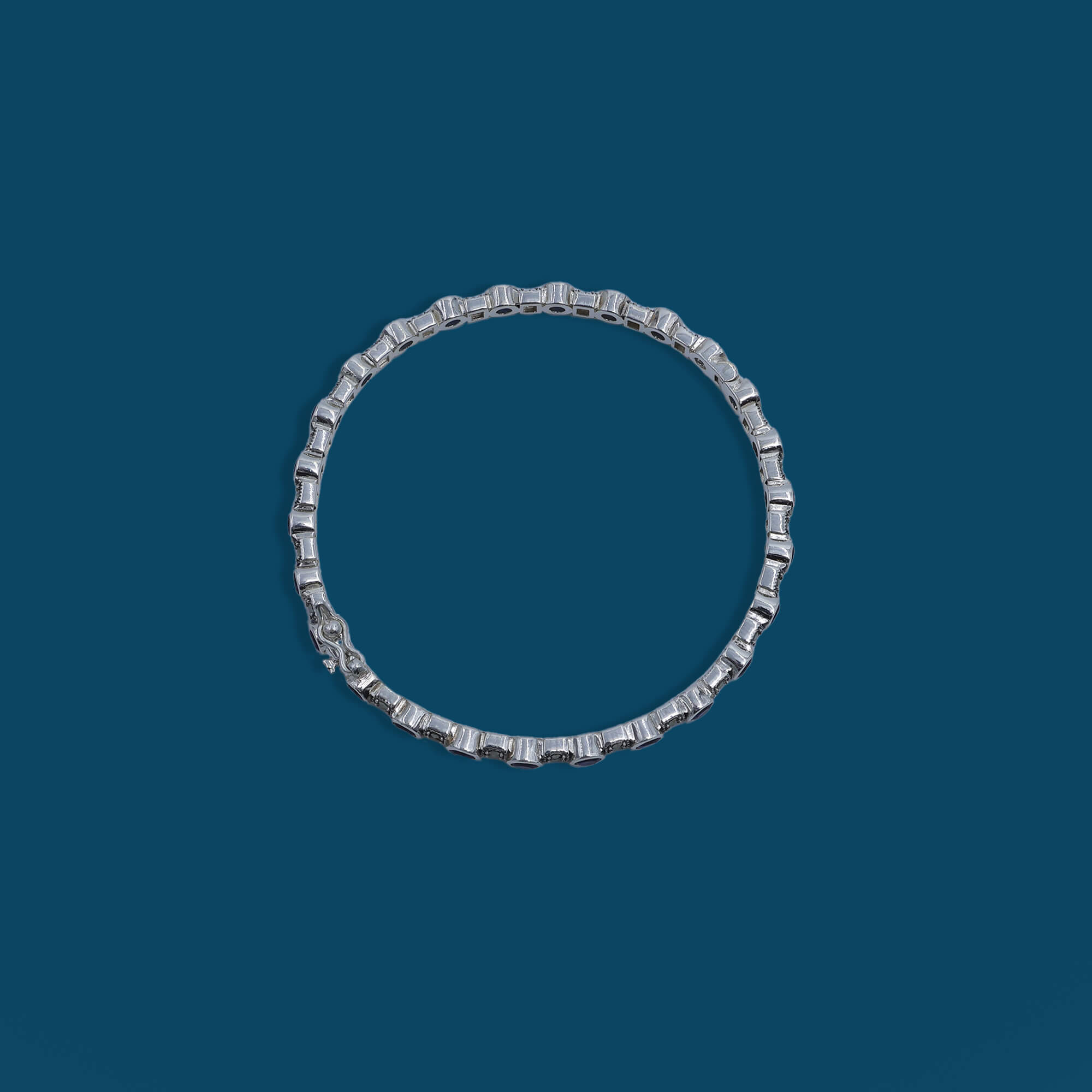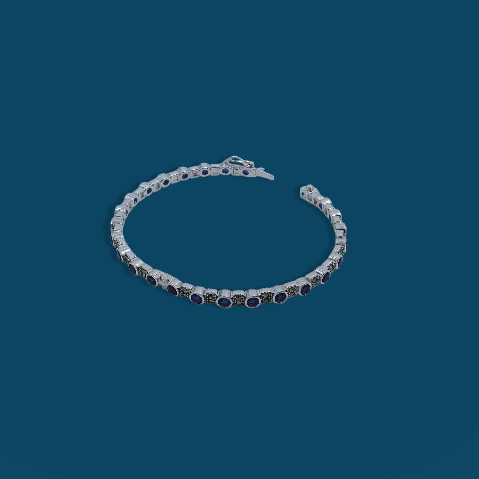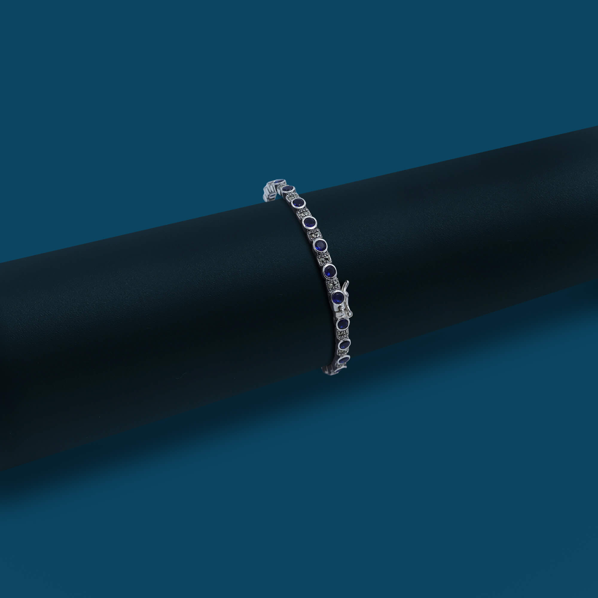 The Azure Geometry Oxidized Kada is a striking 925 sterling silver bracelet, featuring a unique geometric pattern enhanced by alternating blue stones and white CZ stones. The oxidized finish gives the piece a vintage-inspired, rustic charm, while the vivid blue stones add a pop of color and the sparkling CZ stones provide subtle elegance. This thin, intricate kada is perfect for those who appreciate a blend of modern design and timeless appeal, making it a standout accessory for any occasion.
