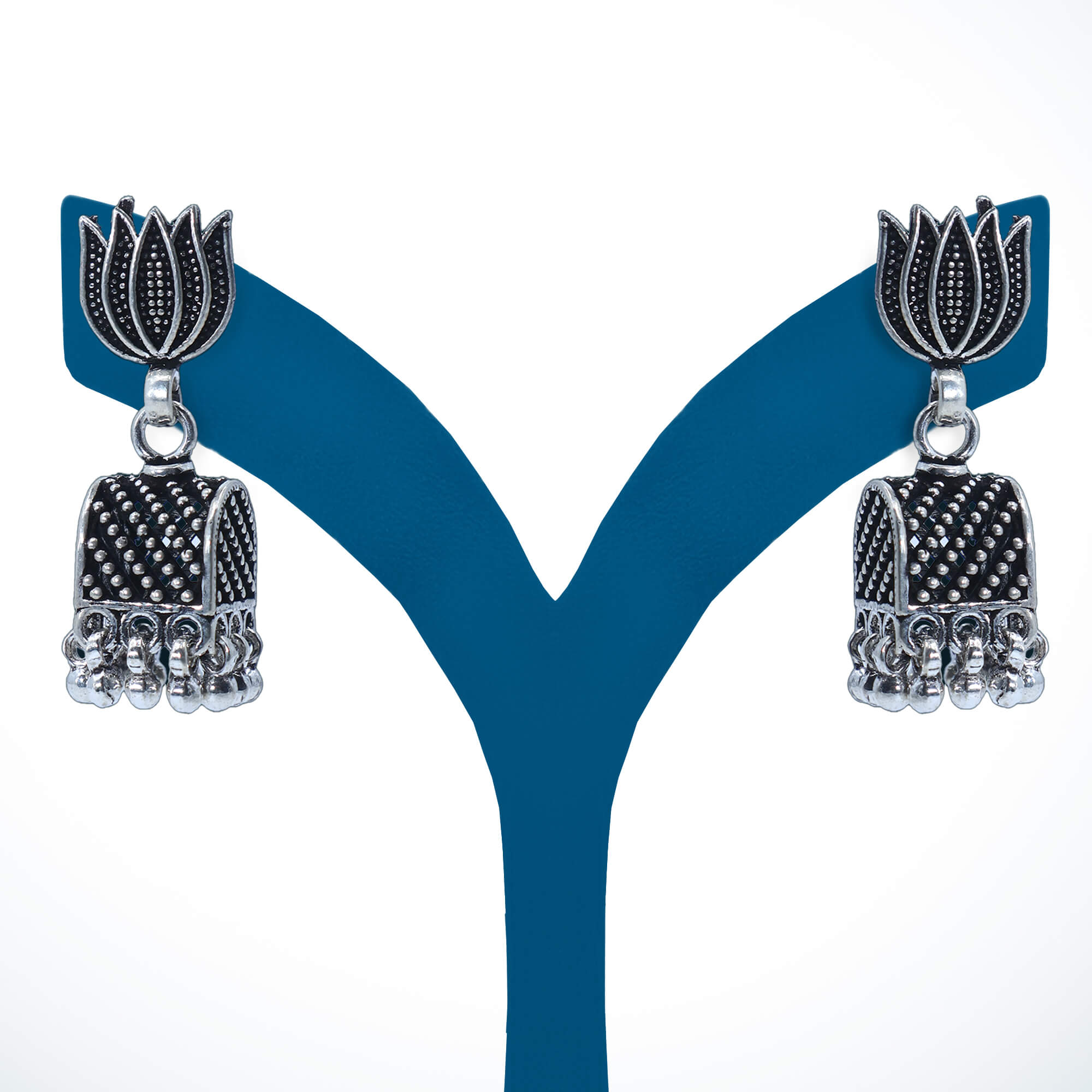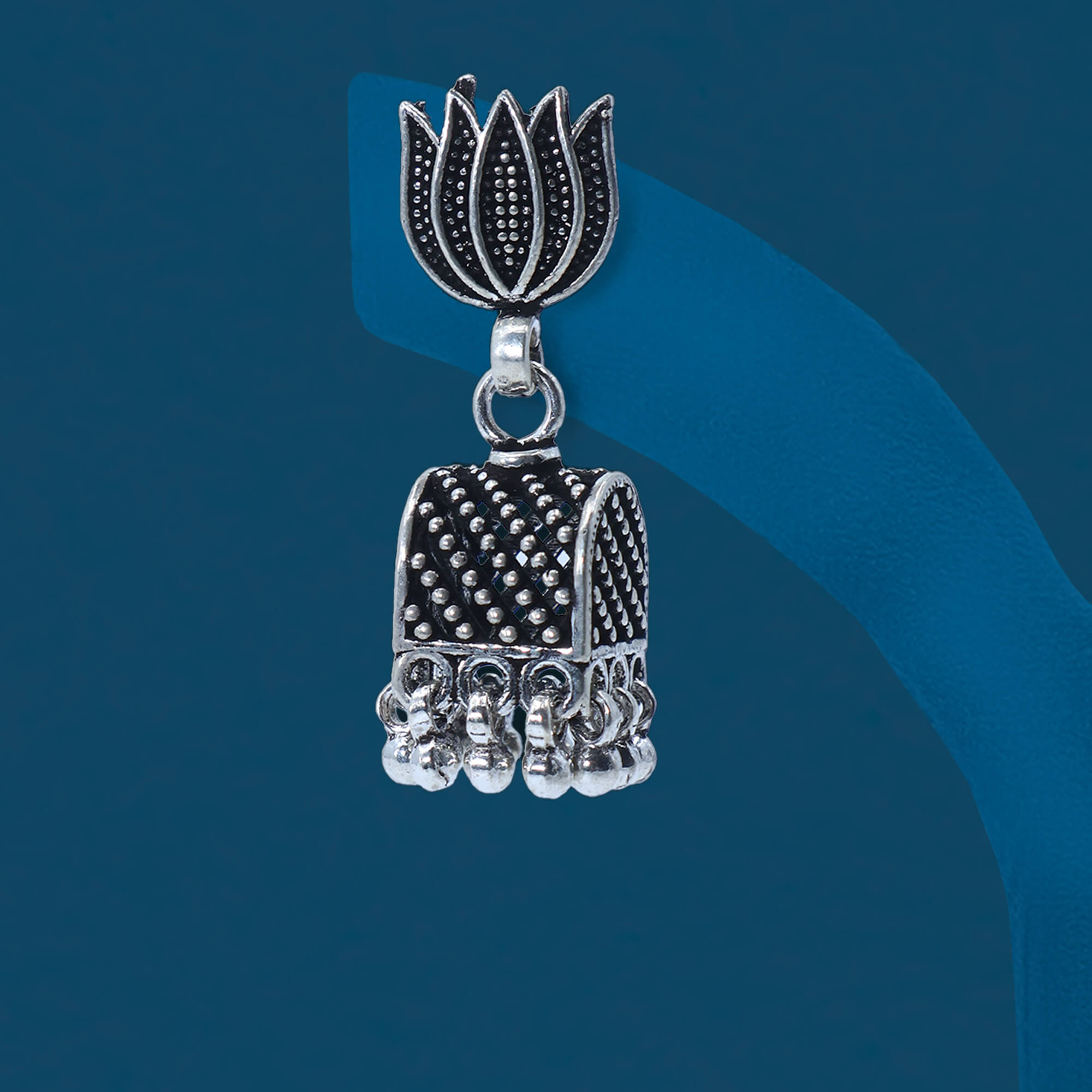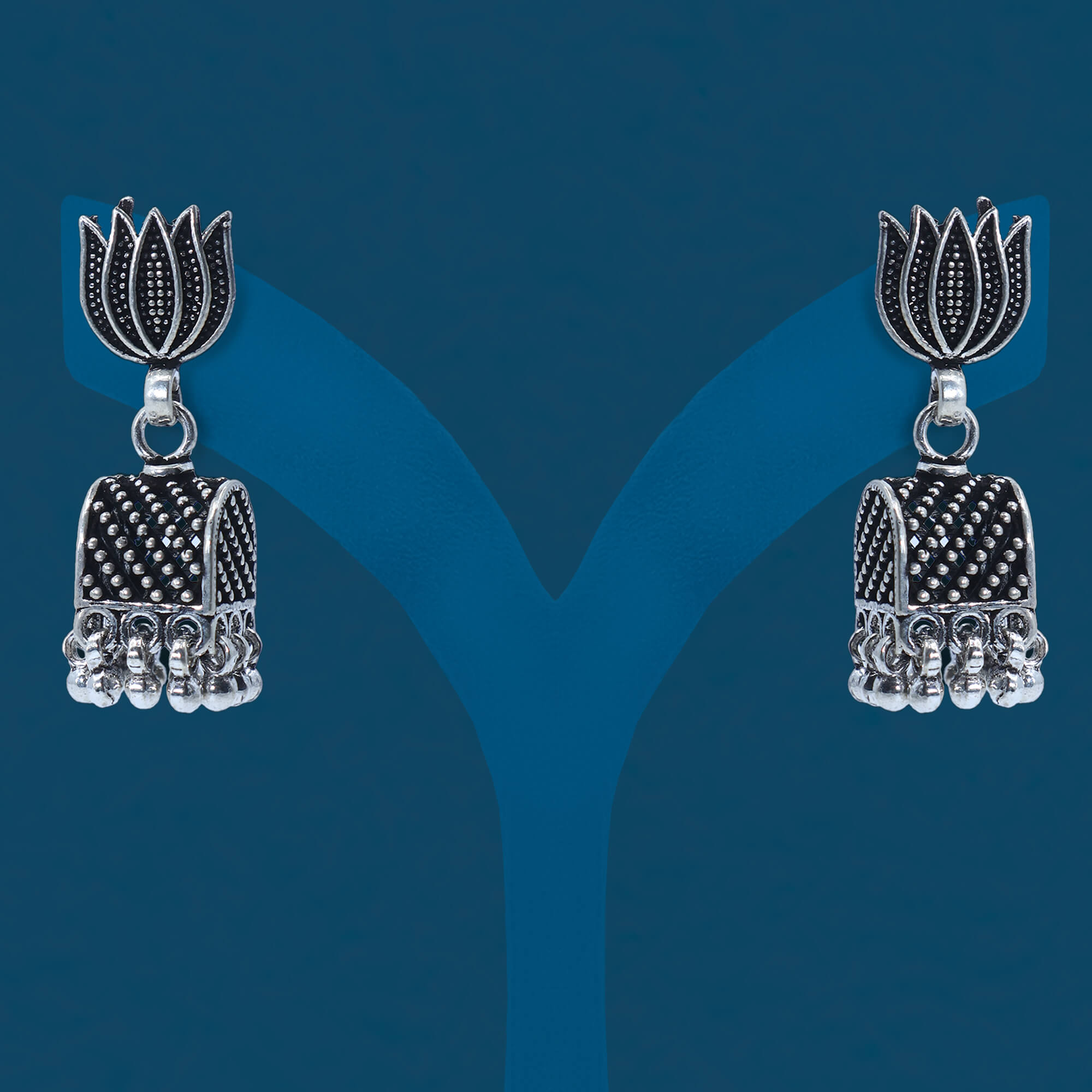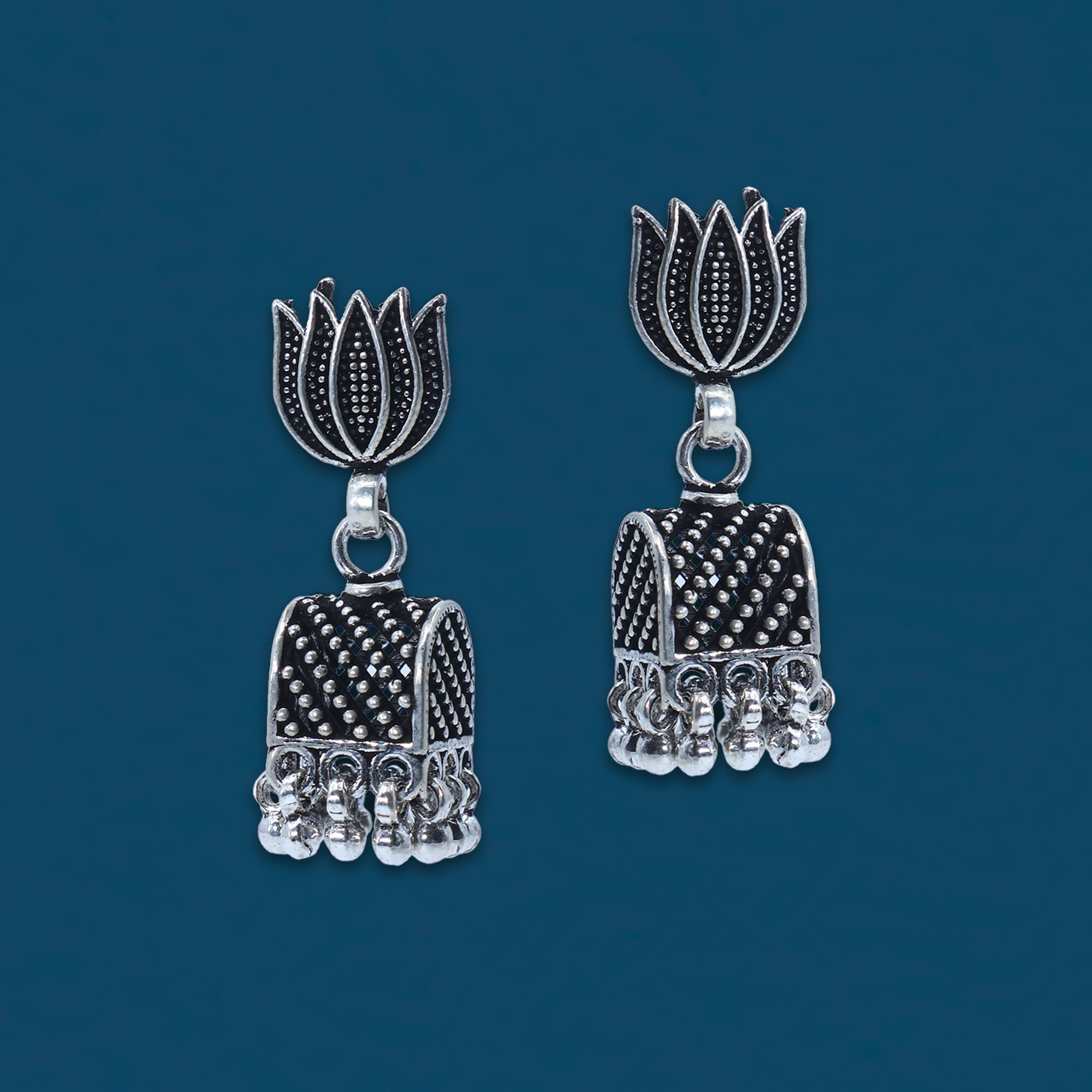 The Sparsha Oxidized Bell Jhumka is a stunning earring crafted from 925 sterling silver with a beautiful oxidized finish. Featuring a traditional bell-shaped design, it is adorned with delicate ghungroo accents, adding a playful, musical charm. Lightweight and elegant, this jhumka is perfect for both casual and festive wear, offering a timeless appeal with its intricate craftsmanship.