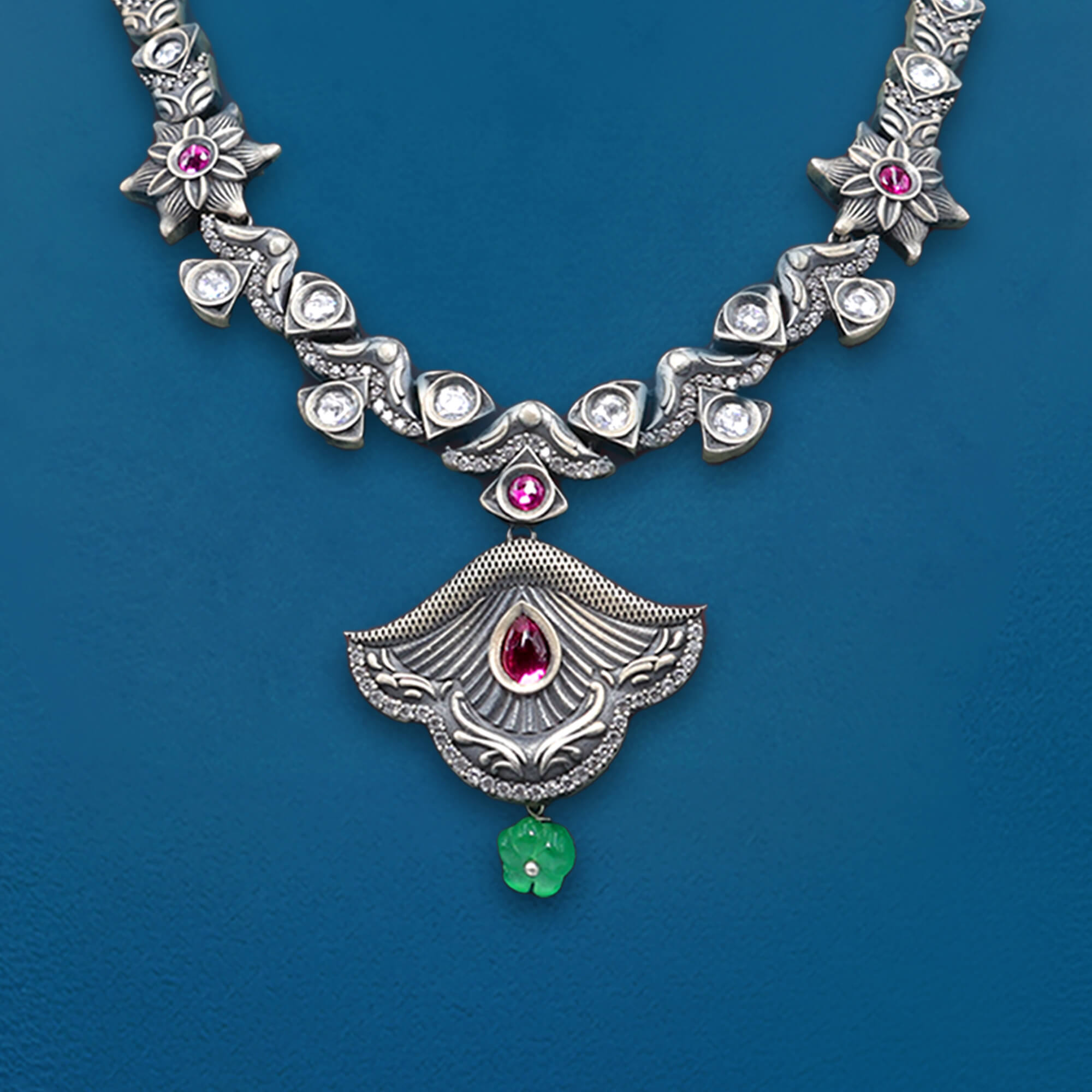The Verdant Charm Necklace is a captivating 925 sterling silver piece that combines nature elegance with timeless beauty. Featuring delicate leaf-inspired designs, each adorned with shimmering stones, this necklace exudes a sophisticated charm. The polished silver finish enhances its refined appeal, while the subtle sparkle of the stones adds a touch of radiance. Perfect for both casual and formal occasions, the Verdant Charm Necklace is an ideal accessory for those who appreciate nature beauty and want to add a touch of elegance to any outfit.