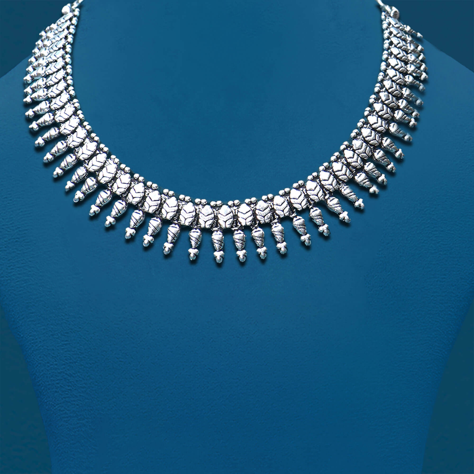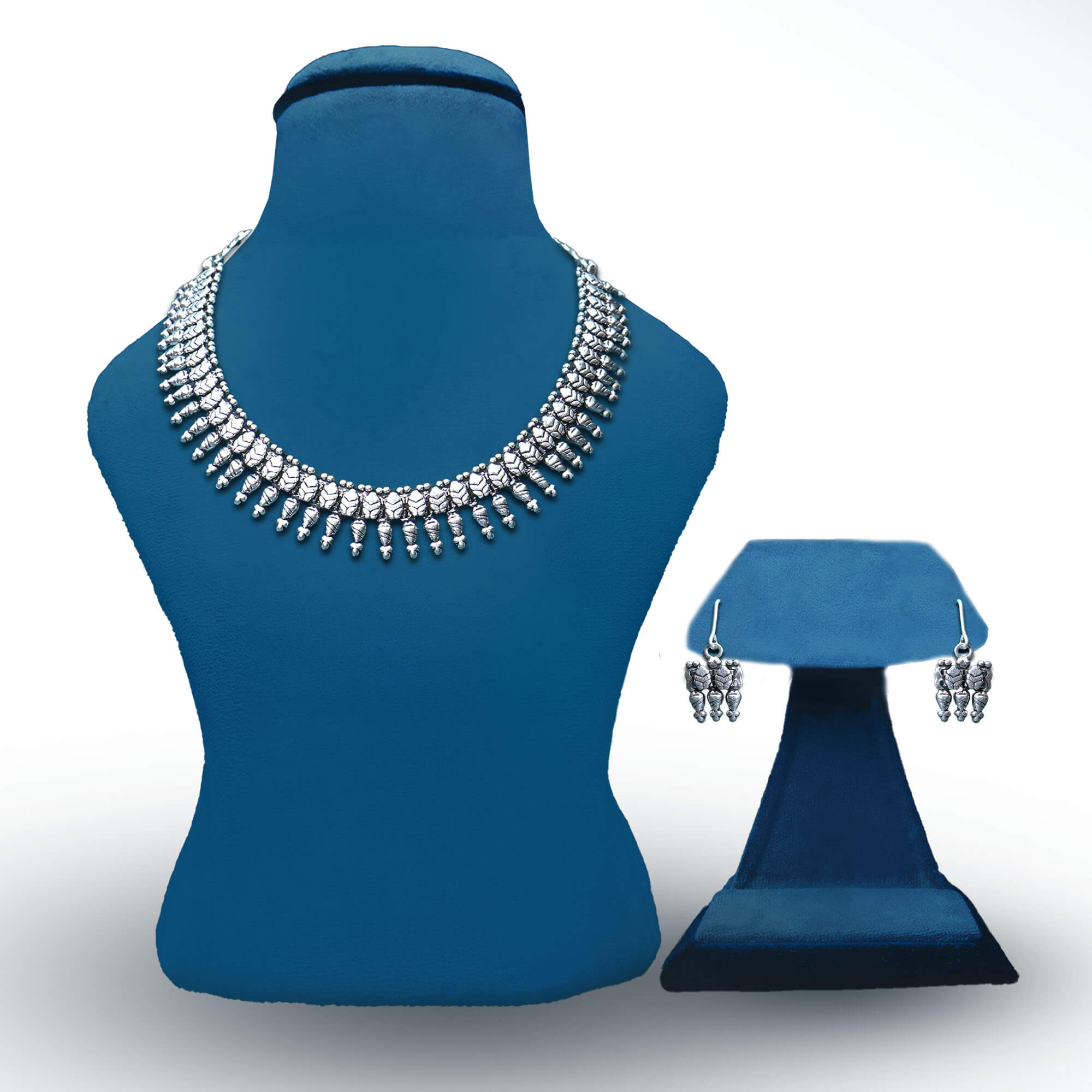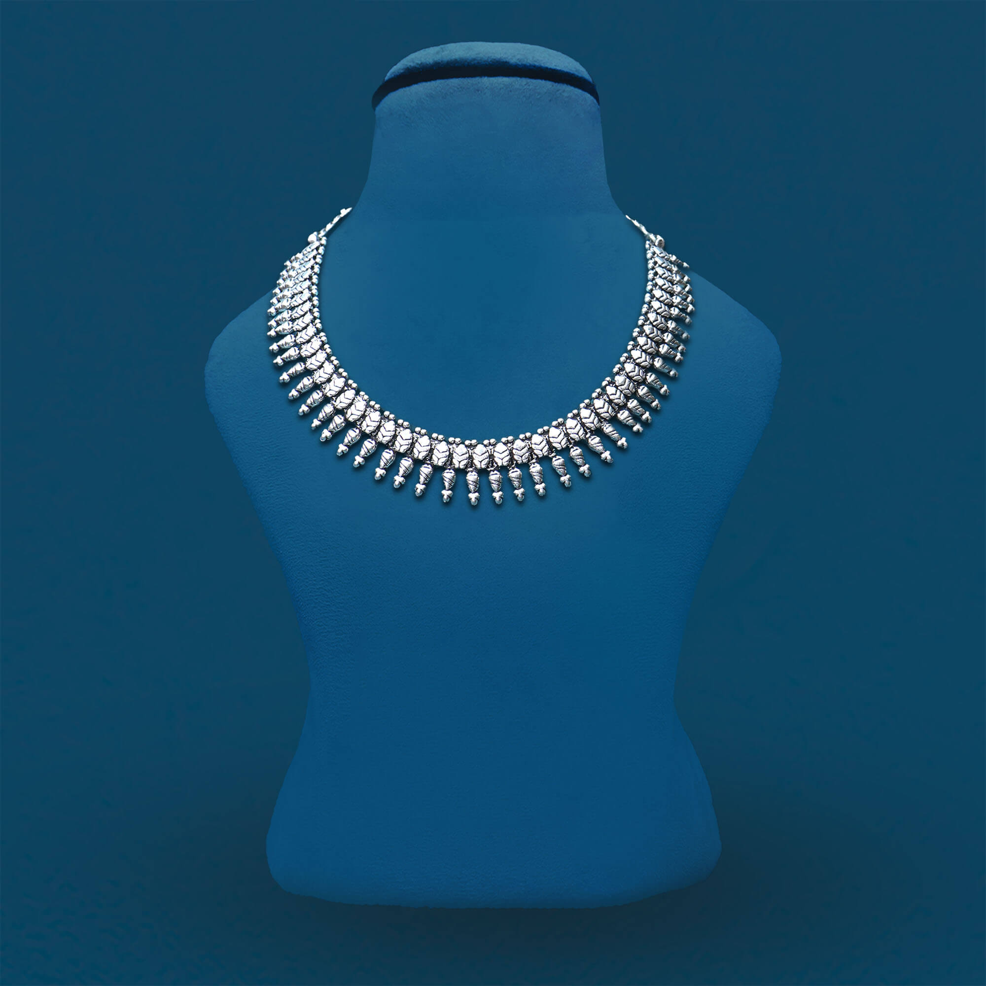 The Leafy Grace Necklace Set is a beautifully crafted piece that celebrates nature elegance. Designed in oxidized silver, the necklace features delicate leaf-shaped motifs arranged in a graceful pattern that sits comfortably around the neck. Each leaf is intricately detailed, adding depth and texture to the design. The set includes matching earrings that mirror the necklace sophisticated and nature-inspired theme. The oxidized finish gives the set a timeless, vintage look, making it a perfect choice for formal occasions or adding a touch of understated elegance to everyday wear. The Leafy Grace Necklace Set exudes a natural charm and refined beauty.