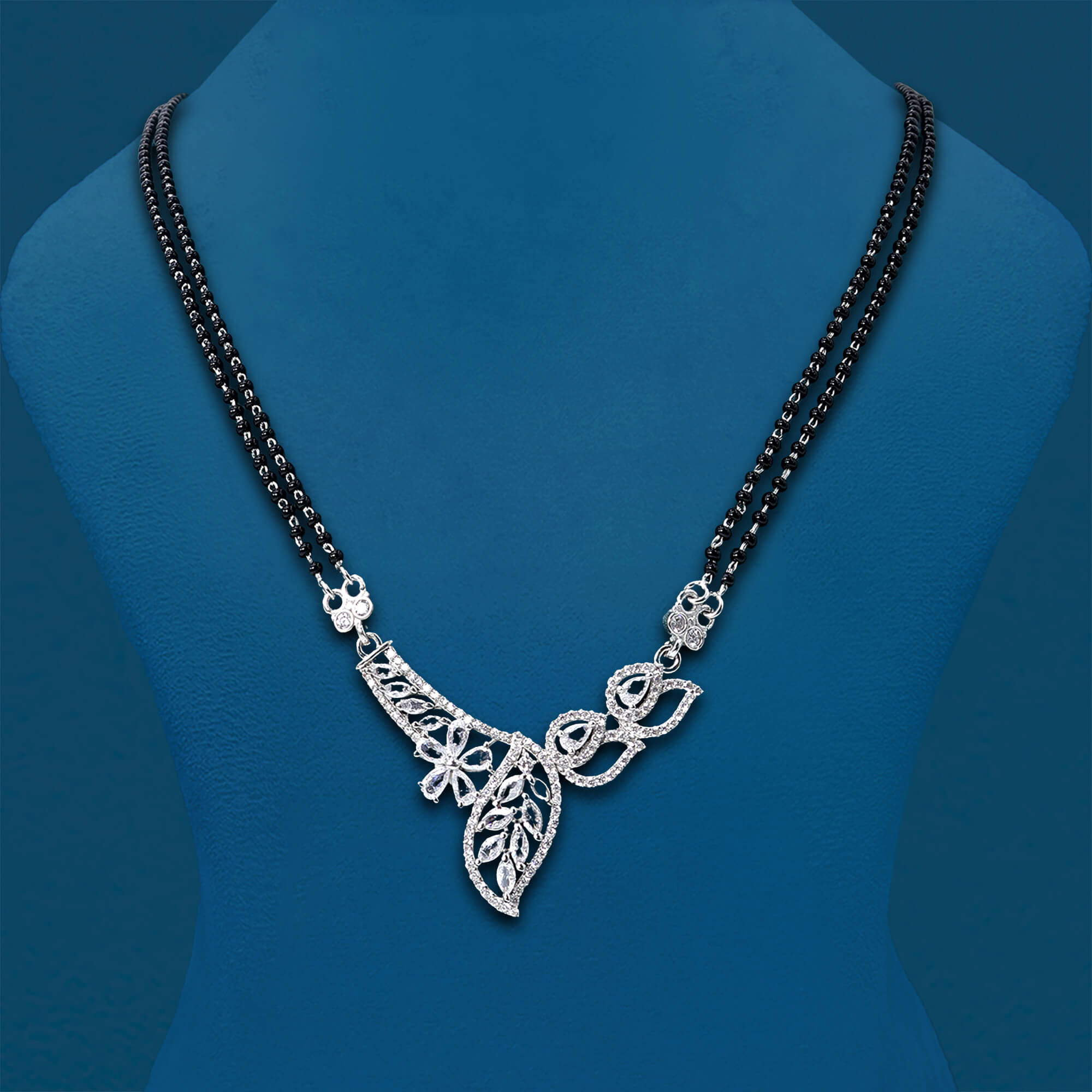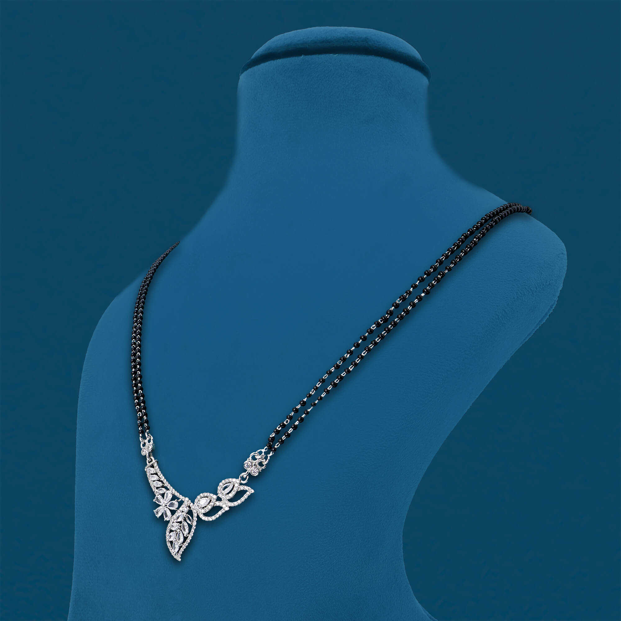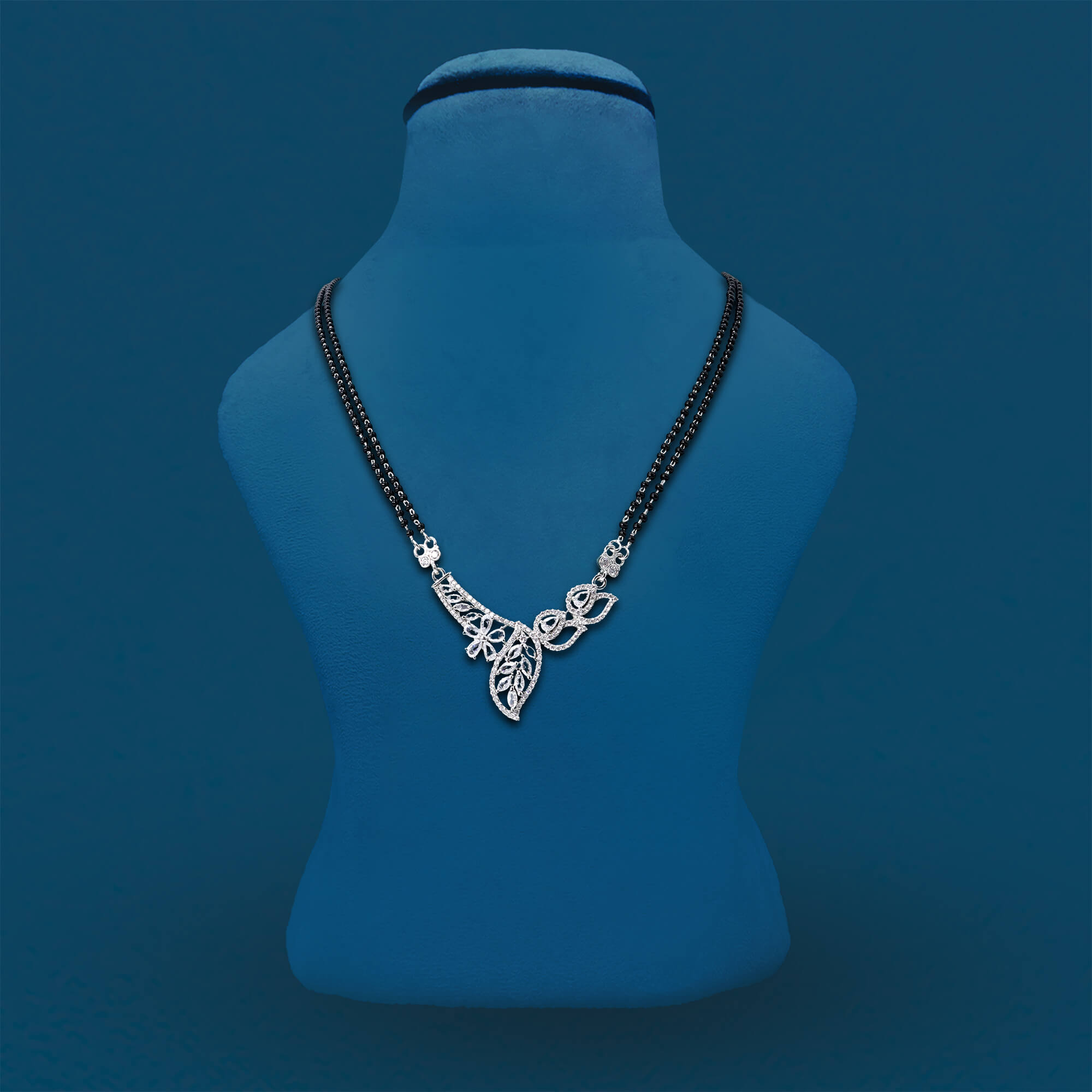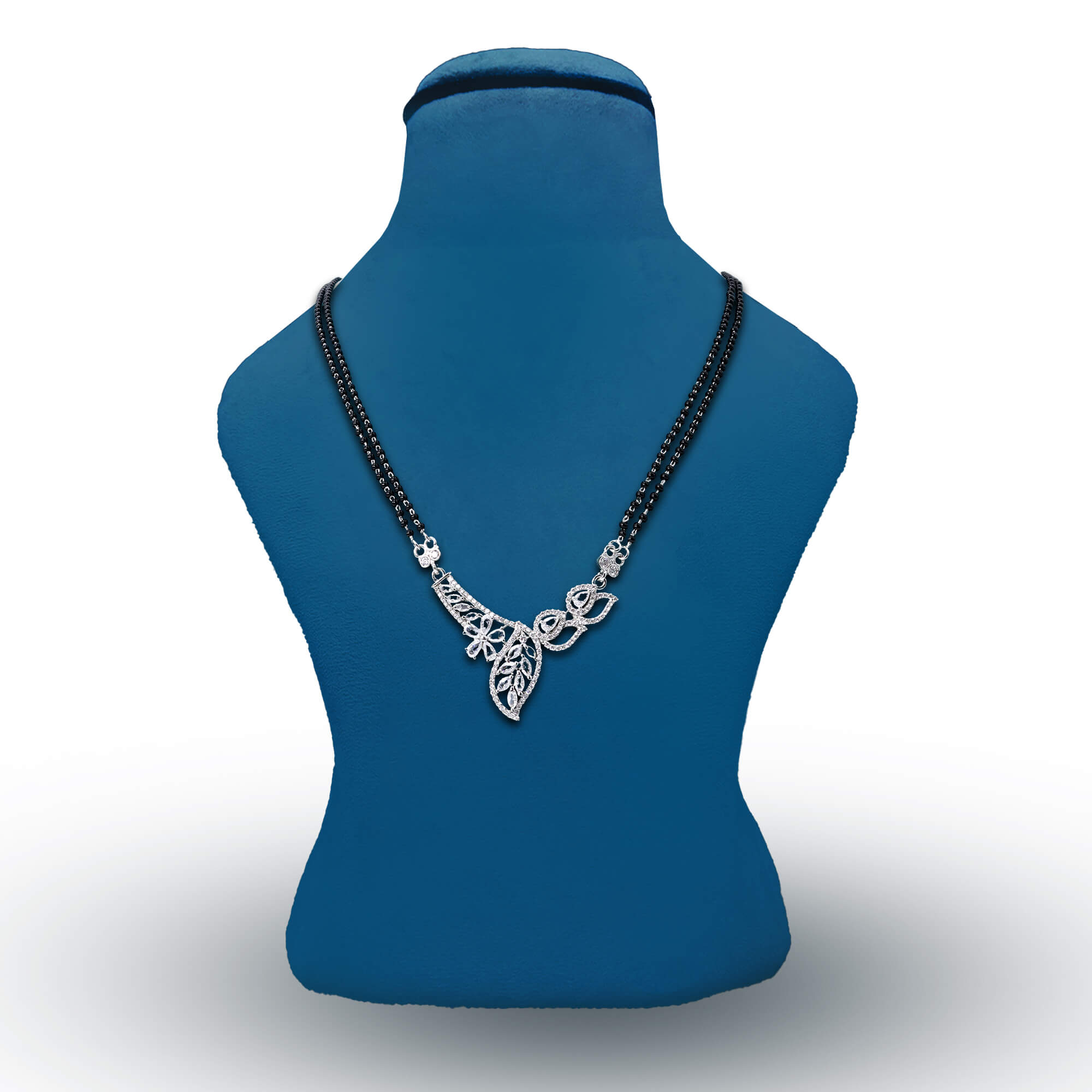 The Floral Serenity Mangal Sutra is a beautifully crafted piece in 925 silver, designed to embody both elegance and tradition. The locket features an exquisite leaf and flower design, enhanced with sparkling CZ stones that add a touch of modern elegance to this timeless accessory. The delicate yet durable silver chain ensures comfort and lasting wear, while the intricate detailing of the locket symbolizes harmony and beauty. Perfect for weddings or other significant occasions, the Floral Serenity Mangal Sutra is a meaningful and graceful piece that blends traditional symbolism with contemporary sophistication.