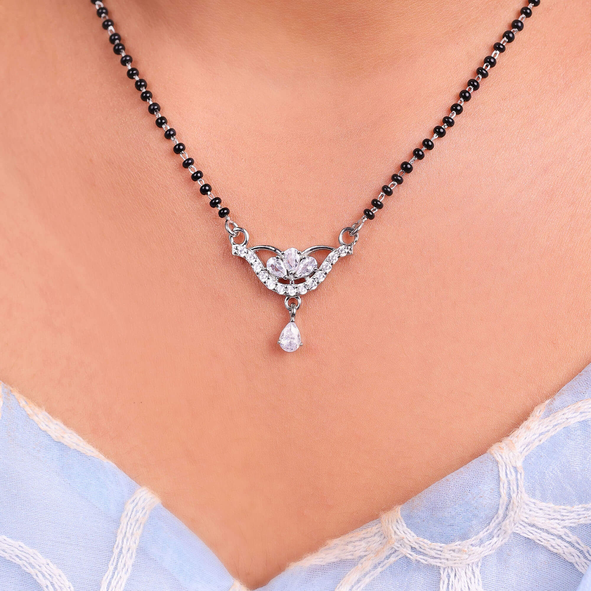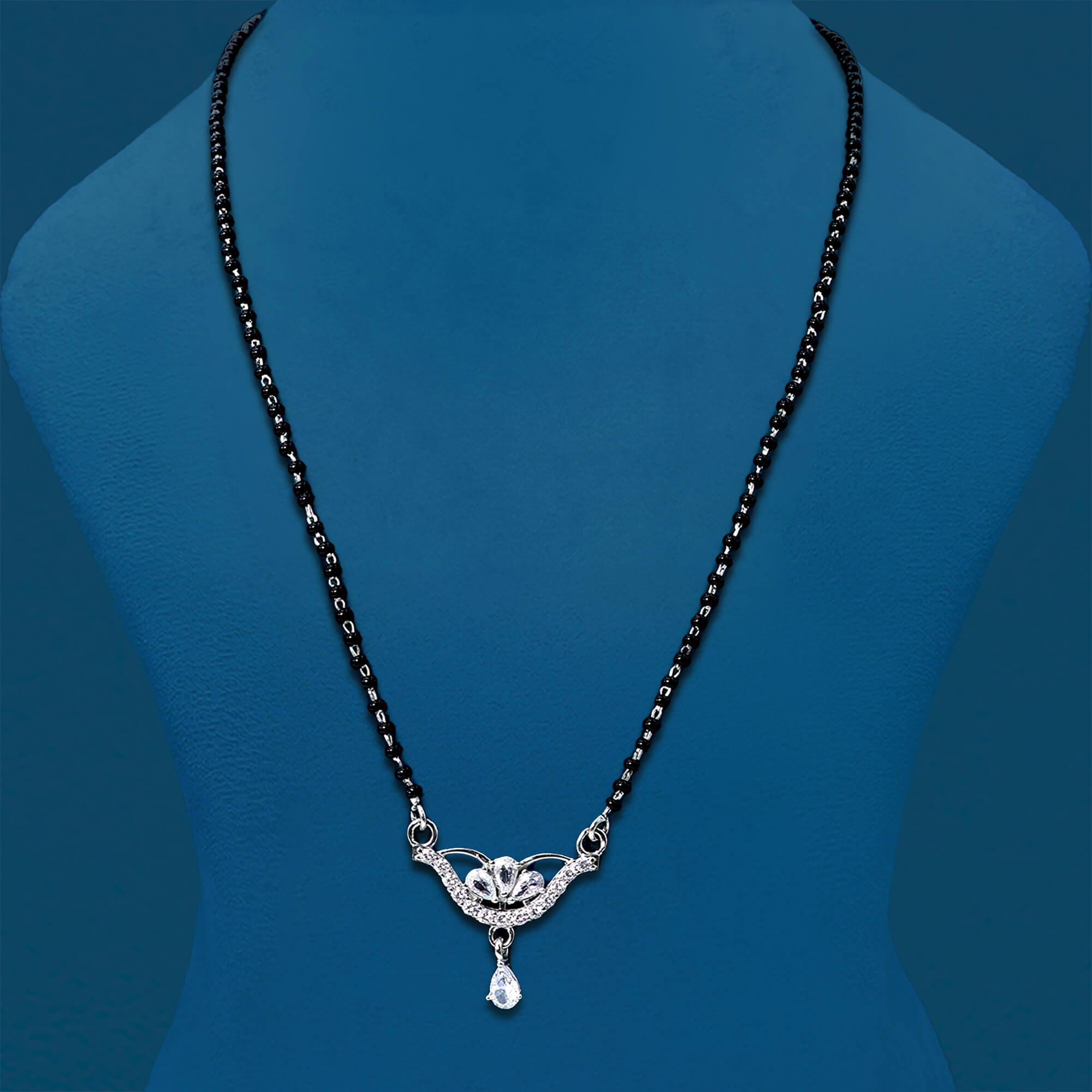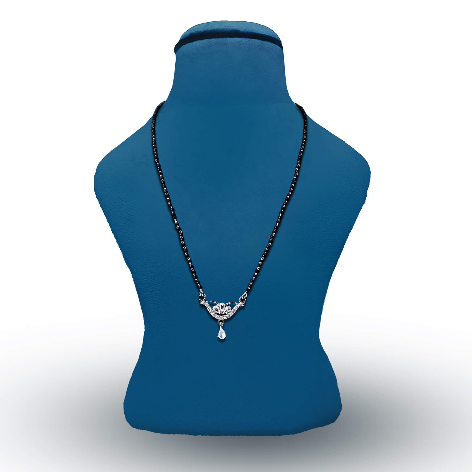 The Radiant Bliss Mangal Sutra is a beautiful and sophisticated piece of jewelry, crafted from high-quality 925 sterling silver. This mangal sutra features a delicate locket adorned with sparkling CZ stones that add a touch of elegance and brilliance. A small pendant hangs gracefully from the locket, enhancing its timeless charm. The intricate design blends tradition with a modern twist, making it a perfect choice for contemporary brides. With its radiant shine and meaningful symbolism, the Radiant Bliss Mangal Sutra is a symbol of love and commitment, perfect for special occasions and everyday wear.