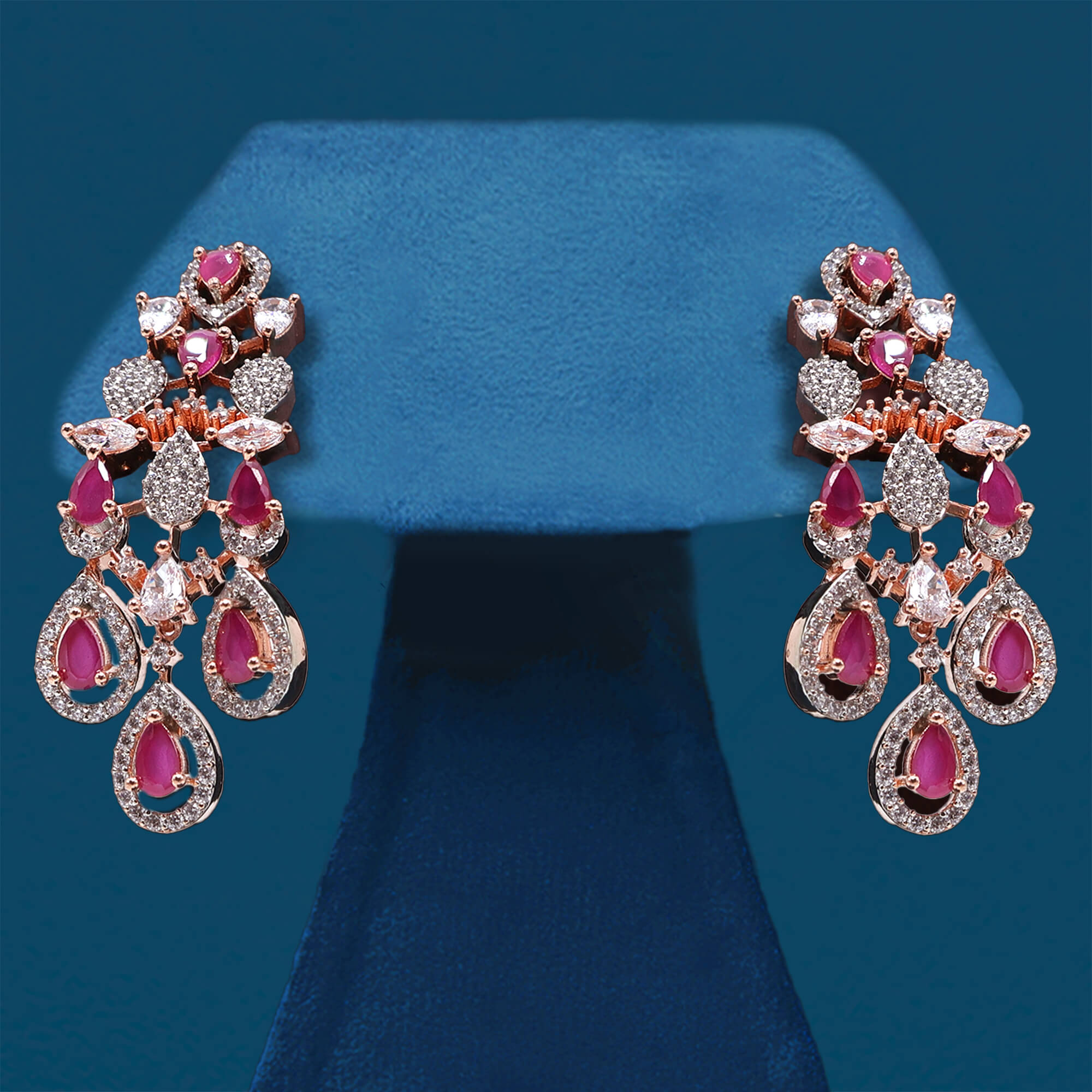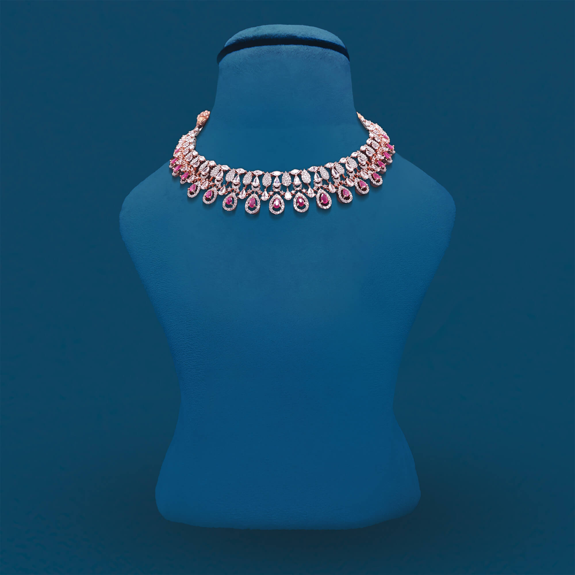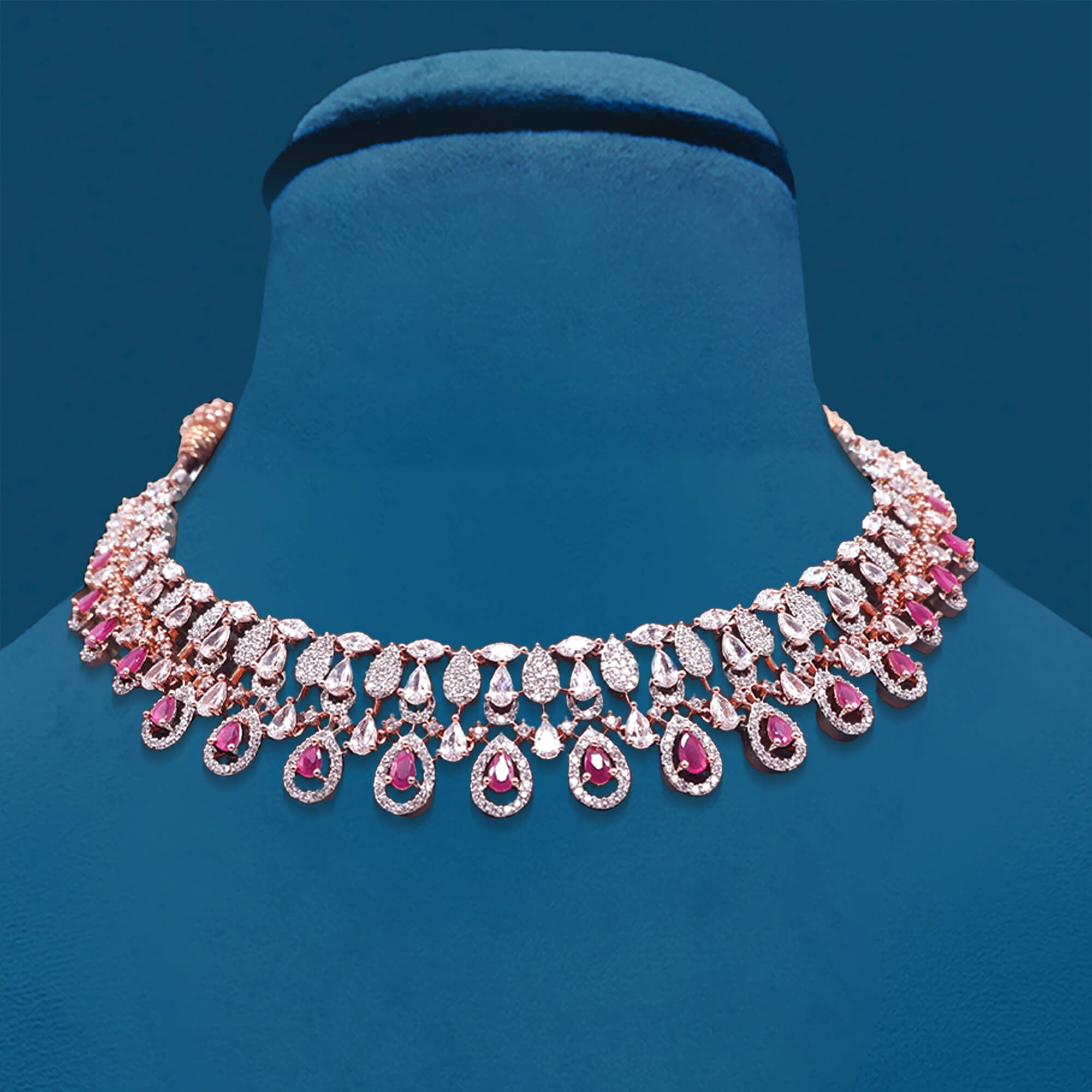 The Blushing Ruby Choker is a stunning piece crafted in rose gold, featuring a delicate arrangement of white CZ stones and striking red stones that drop elegantly, creating a vibrant contrast. The choker design sits gracefully on the neck, offering a sophisticated and modern look. The rich red stones, paired with the sparkling white CZ accents, bring out a radiant charm, making this necklace perfect for special occasions or adding a touch of luxury to any outfit. The Blushing Ruby Choker is a beautiful statement of elegance, making it a timeless addition to any jewelry collection.
