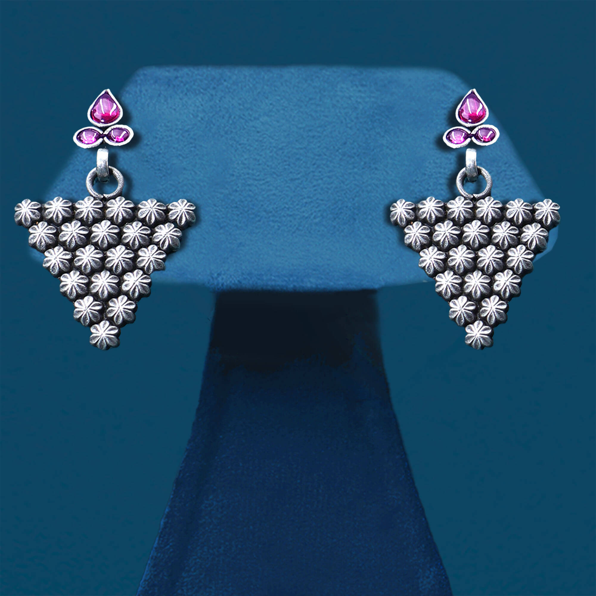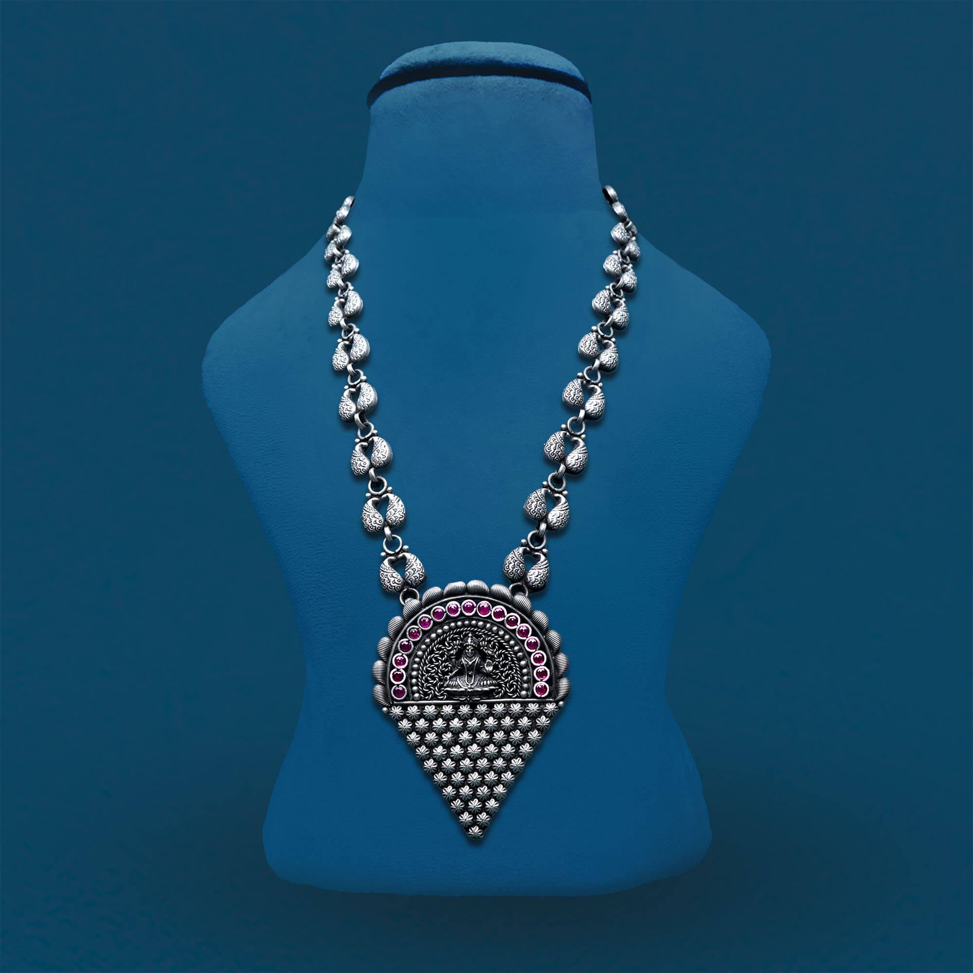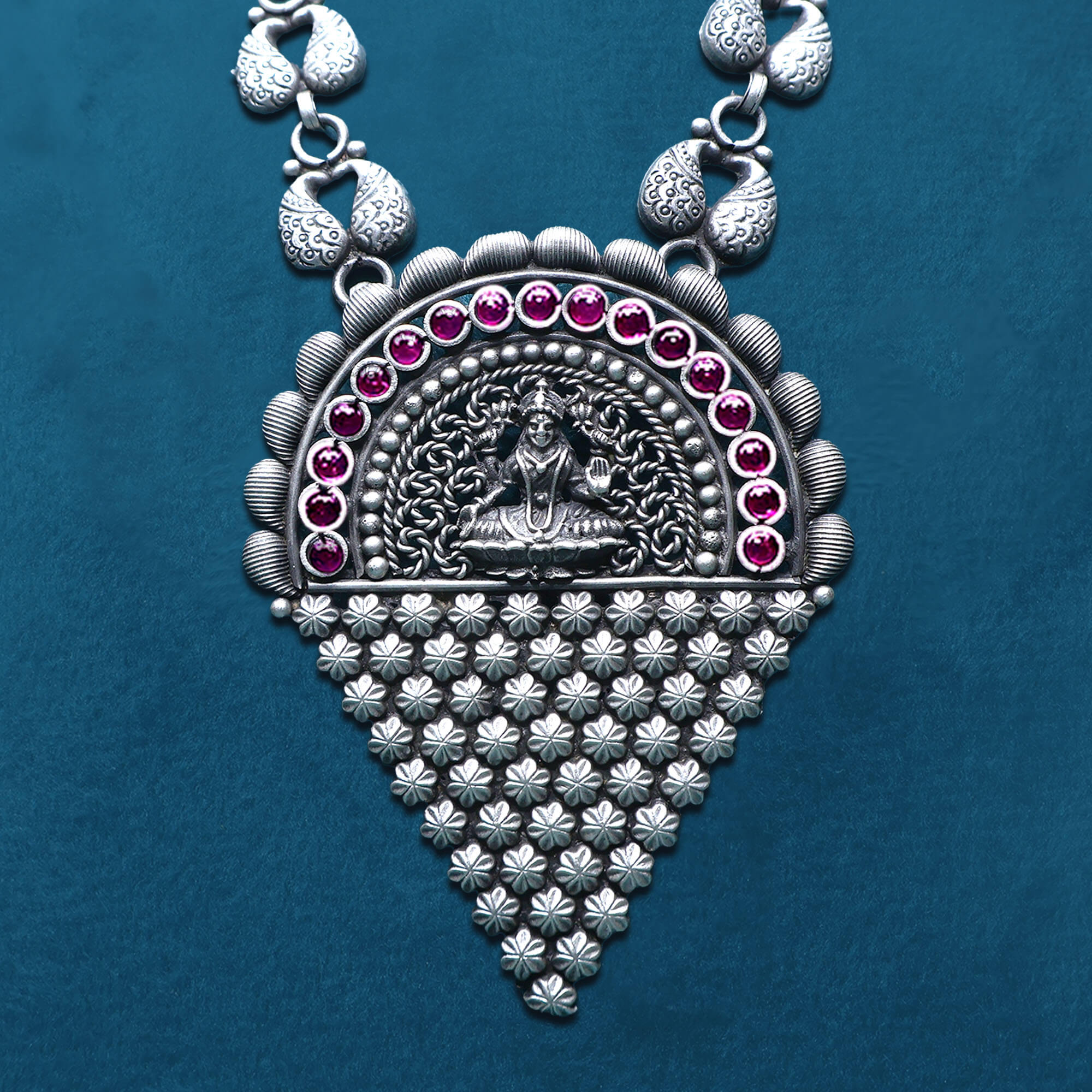 The Floral Divine Laxmi Necklace Set is a stunning piece that beautifully combines intricate floral designs with the divine presence of Goddess Laxmi. Crafted in oxidized silver, the necklace features a graceful triangular flower pattern, with a central Goddess Laxmi pendant symbolizing prosperity and abundance. The delicate floral motifs surrounding the pendant add an elegant, nature-inspired touch, while the intricate craftsmanship enhances the set’s timeless appeal. Perfect for special occasions or religious celebrations, this necklace set is a perfect blend of tradition, spirituality, and beauty, making it a meaningful and elegant accessory for any occasion.