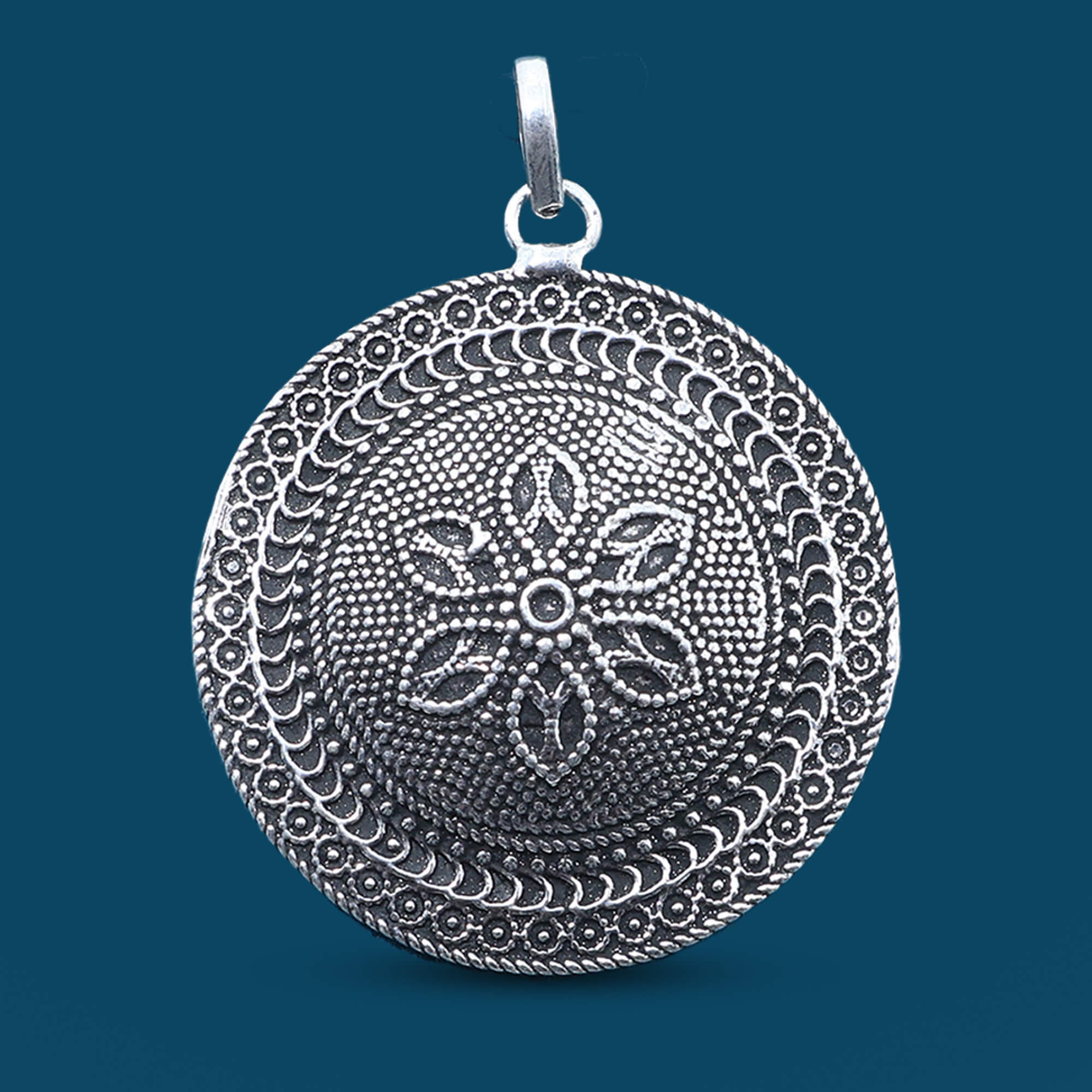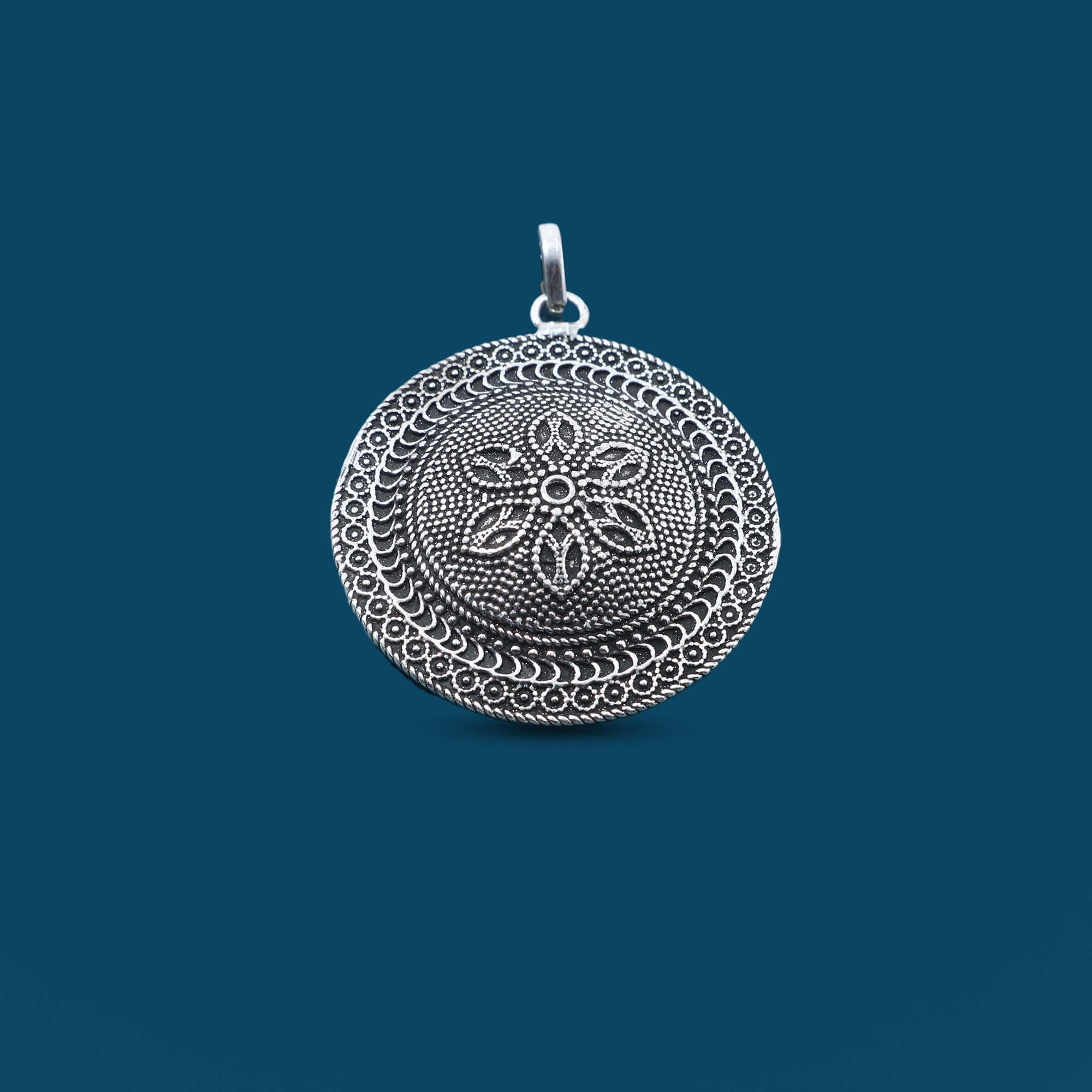 Crafted from 925 sterling silver, this oxidized locket features a beautifully detailed flower at its center, evoking a timeless vintage charm. Its circular design and aged finish make it a perfect keepsake for cherished memories, blending elegance and nostalgia in a unique, eye-catching piece.