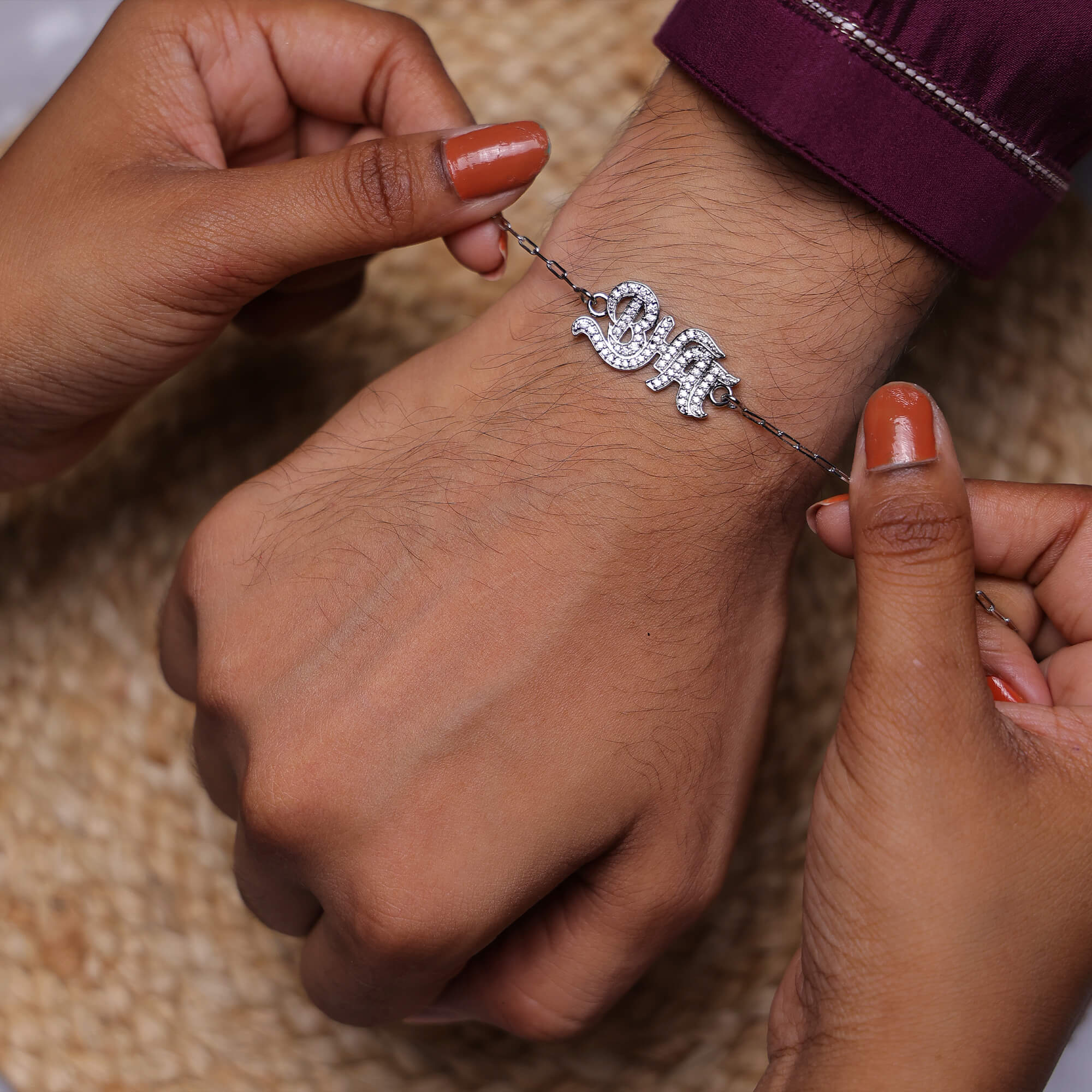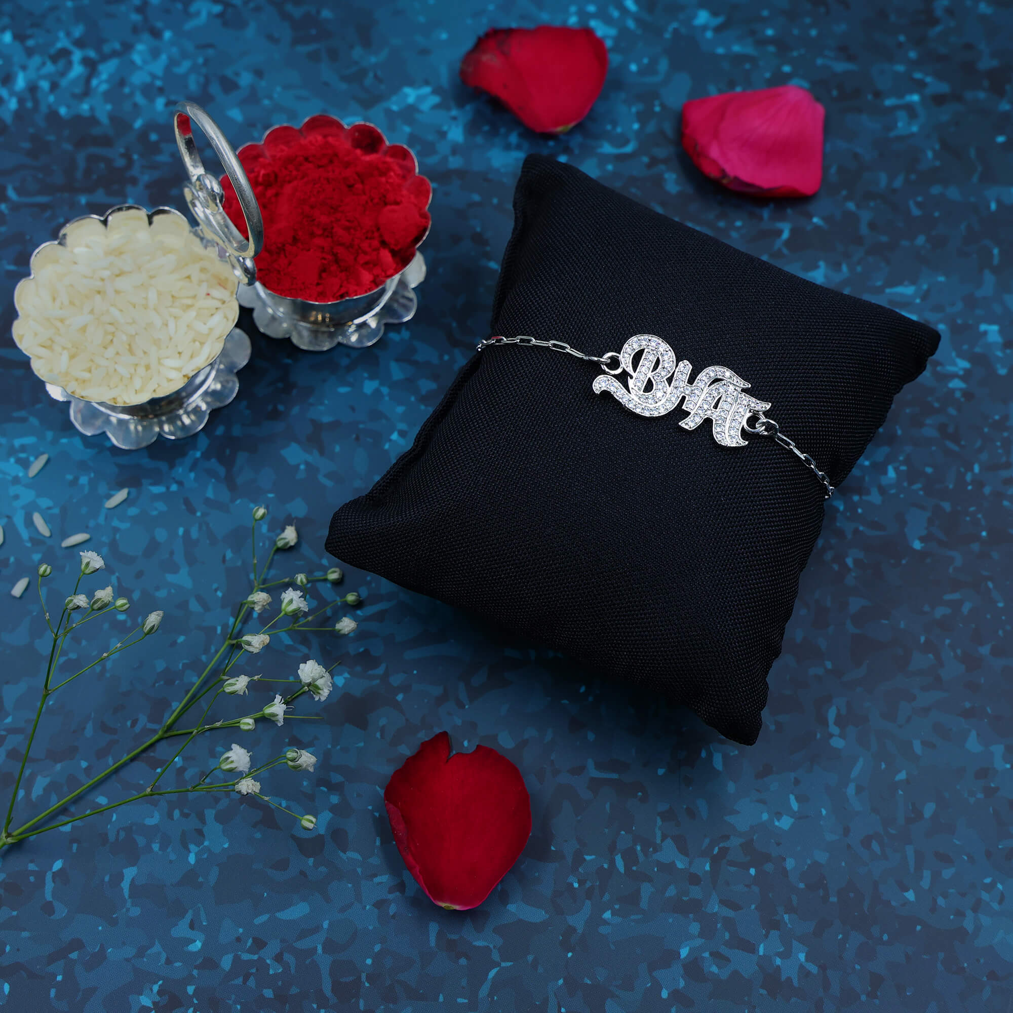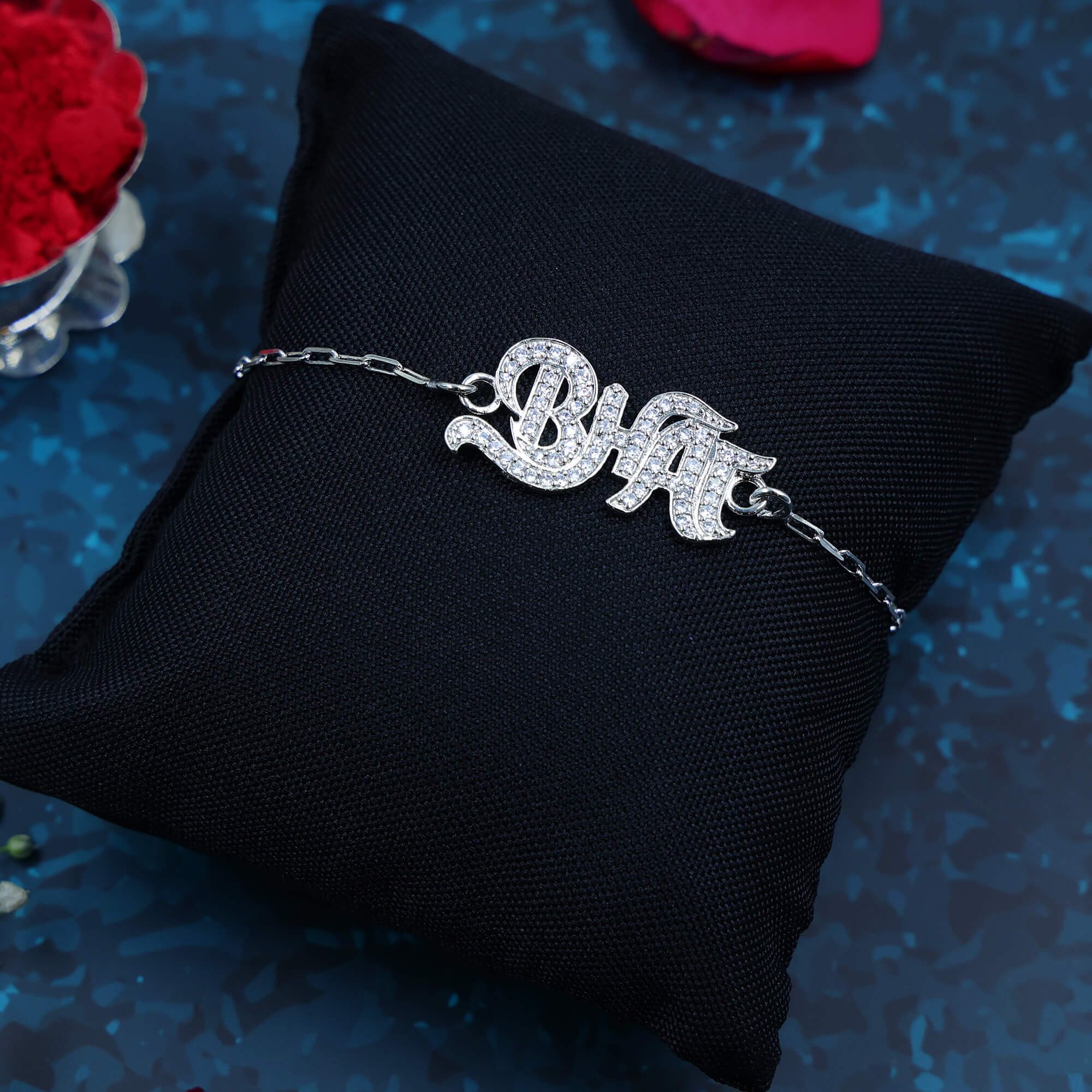 Make your brother feel like the star he truly is with the bold and dazzling Rockstar Bhai Rakhi. Crafted in hallmarked 925 silver, this rakhi spells out “BHAI” in style – fully engraved with shimmering stones, giving it a glamorous and standout look. It’s a perfect match for that brother who is cool, confident, and always in the spotlight. Whether he’s a fashion-forward trendsetter or your all-time favorite hero, this rakhi celebrates his vibe with shine and love.