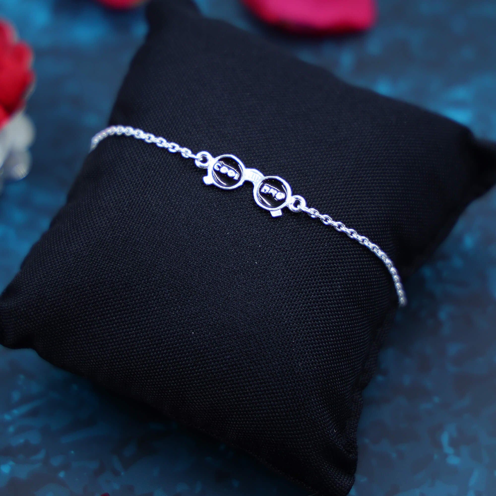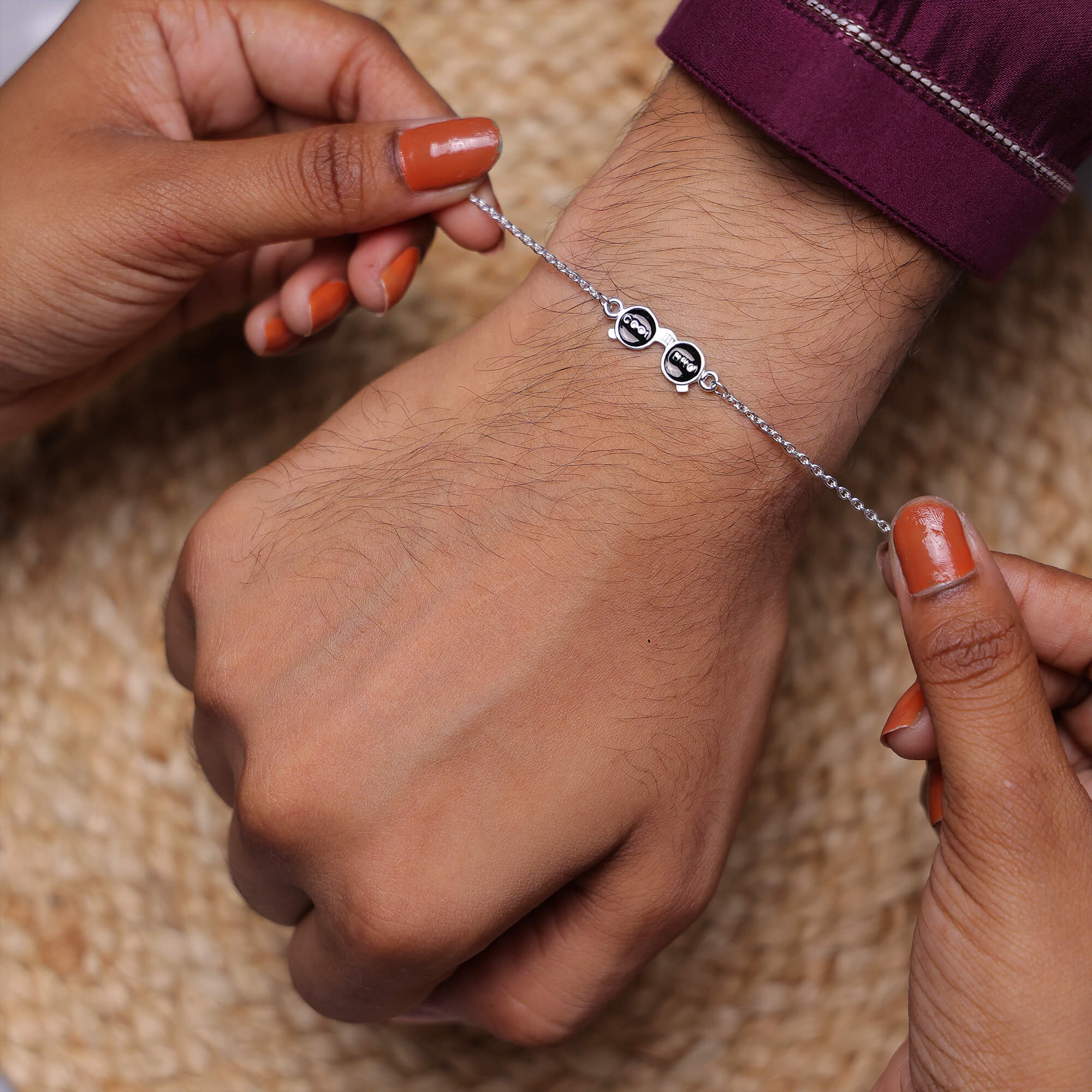 Meet the rakhi made for the most stylish bhai ever — the one who walks with swag, talks with attitude, and rocks his goggle look like no one else. The CoolBro Shades Rakhi features a sleek black sunglasses design, with “Cool” engraved on one side and “Bro” on the other, all crafted in hallmarked 925 sterling silver. This rakhi isn’t just a thread — it’s a fashion statement. Perfect for your trendy, chill, and effortlessly cool brother.