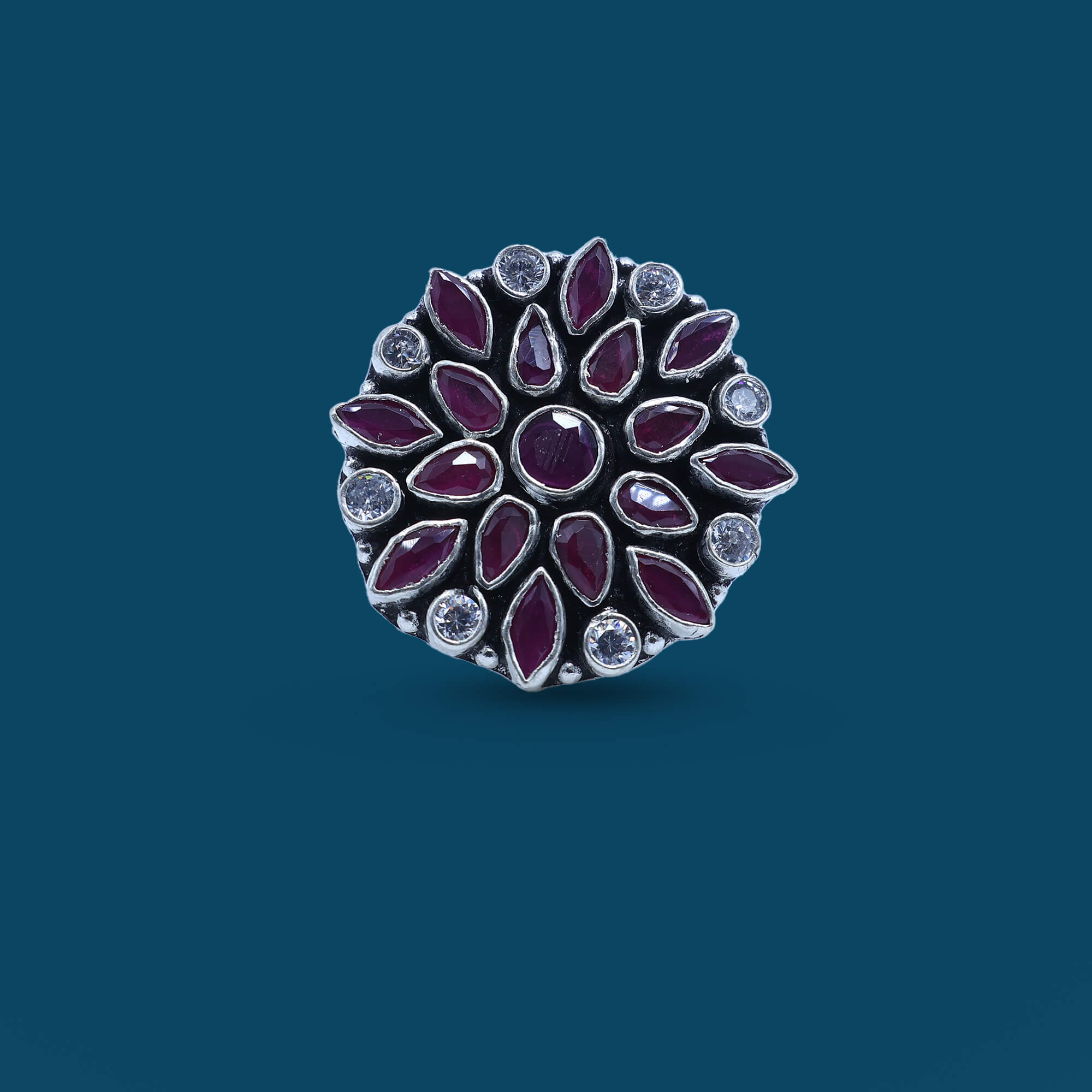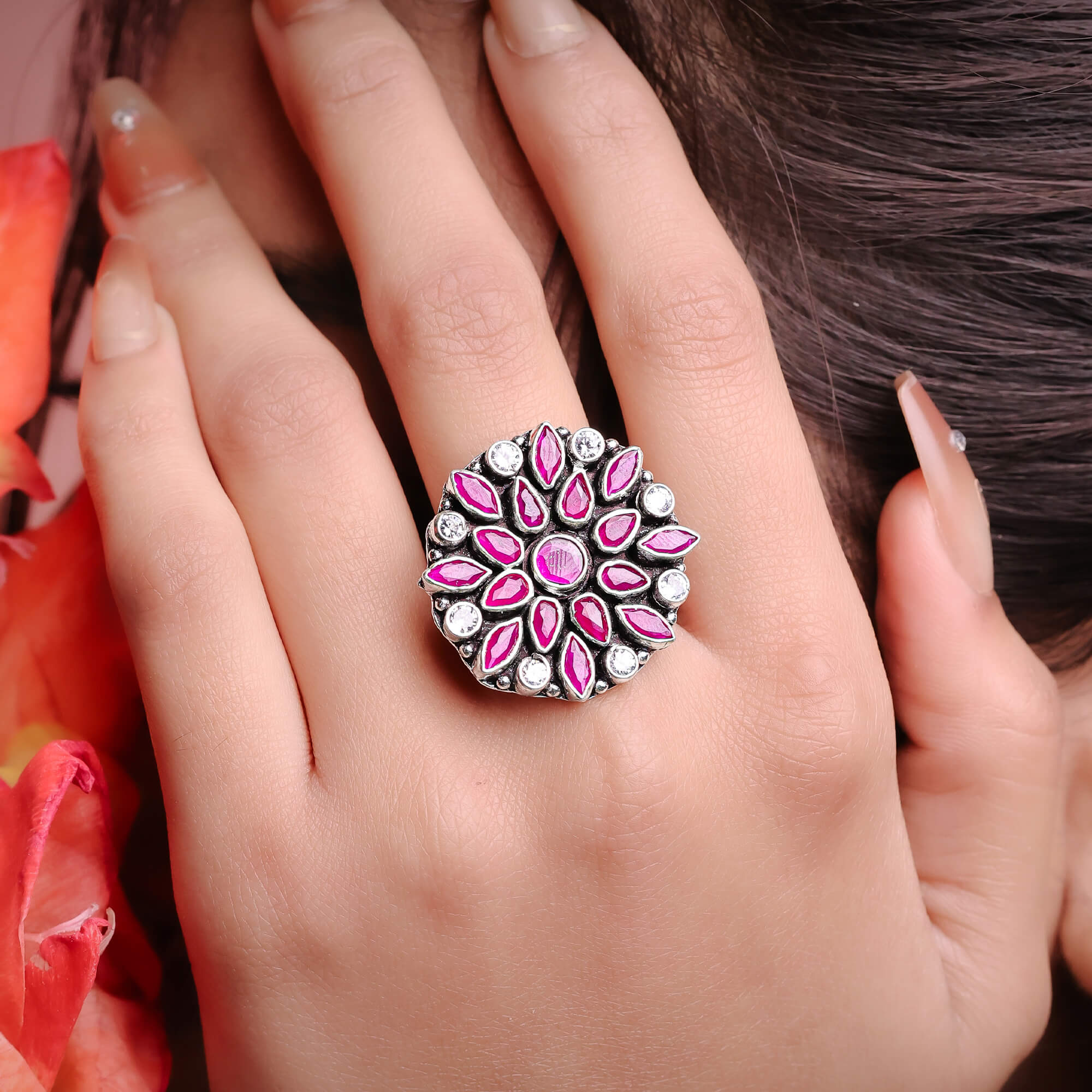 The Kundan Floral Ladies Ring is a beautifully crafted piece that combines the traditional elegance of Kundan with a delicate floral design. Made from high-quality materials, this ring features intricately set Kundan stones arranged in a stunning flower pattern, capturing the essence of nature’s beauty. The stones are carefully placed to create a radiant sparkle, while the smooth band adds comfort and sophistication. Whether worn for a special occasion or as a statement piece, the Kundan Floral Ladies Ring exudes timeless charm and grace, making it the perfect accessory to enhance any ensemble with a touch of traditional opulence.