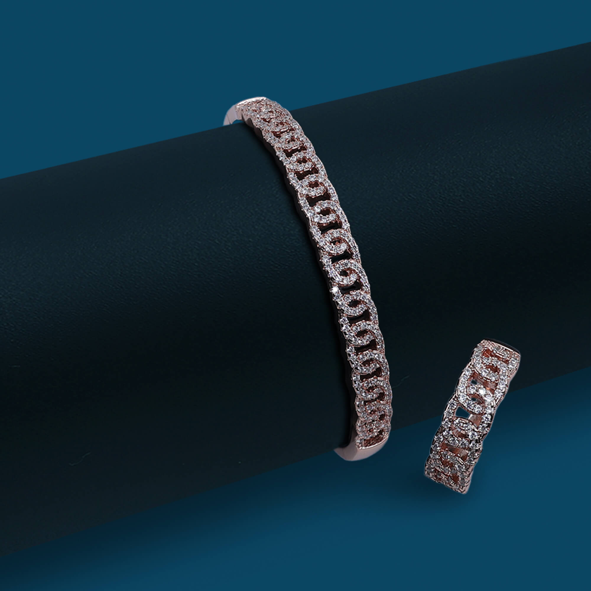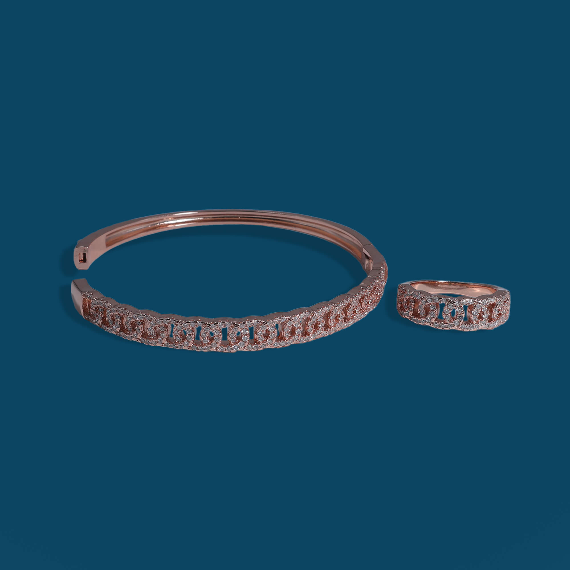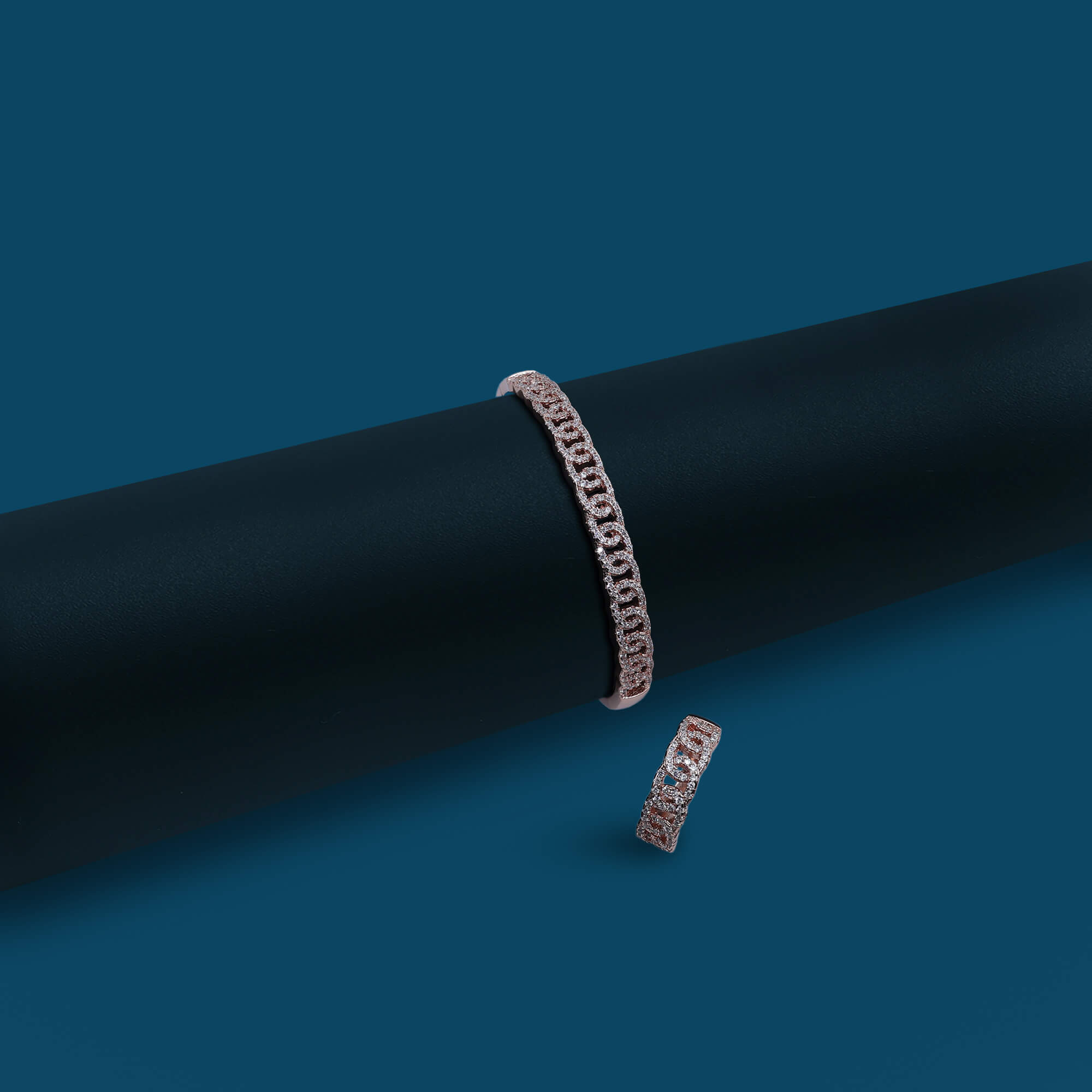 The Rose Twist Bracelet & Ring set is a stunning combination of elegance and contemporary design. Crafted in 925 sterling silver with a luxurious rose gold polish, the set features a captivating spiral twist design, accentuated with sparkling micro CZ stones. The bracelet wraps gracefully around the wrist, while the matching ring adds a touch of refined glamour to the hand. Ideal for both casual and formal occasions, this set offers a perfect balance of modern sophistication and timeless beauty, making it a must-have addition to any jewelry collection.